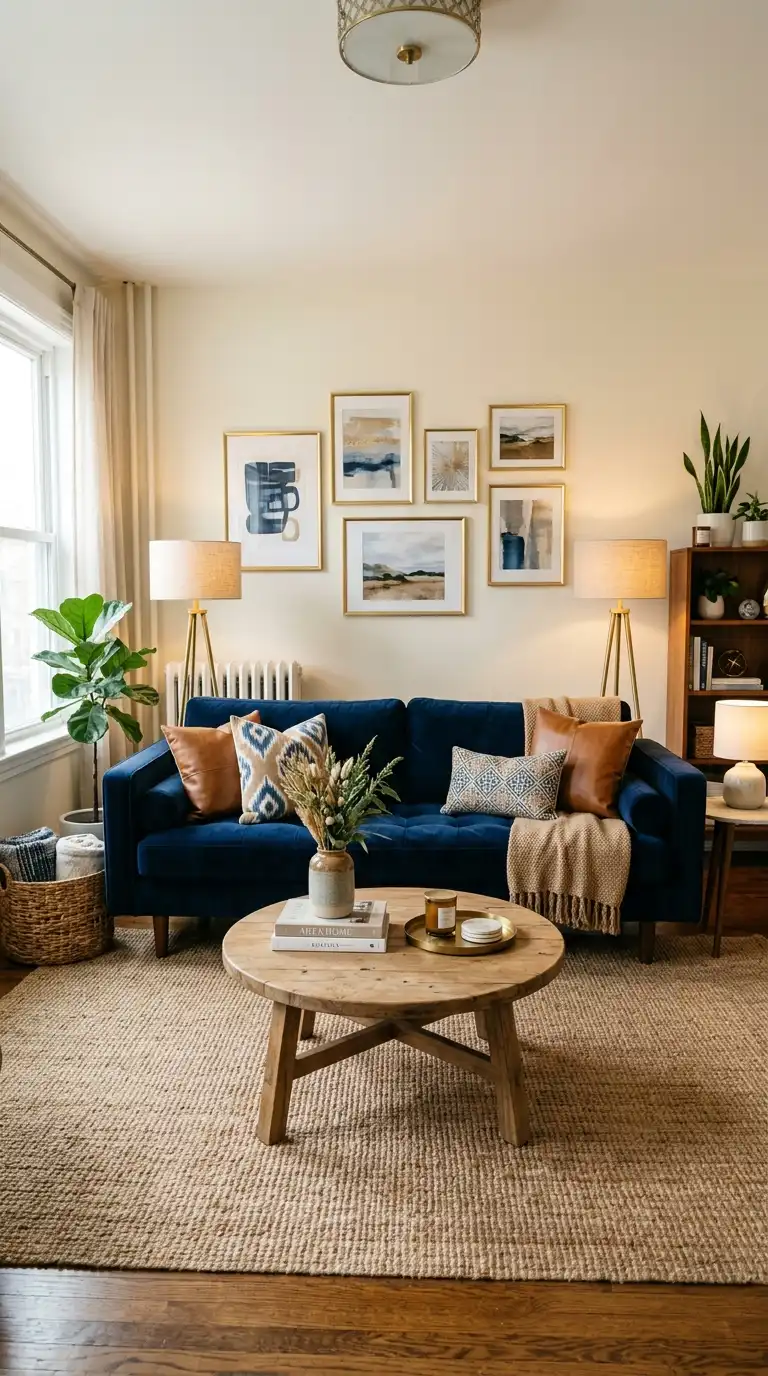 Layering textiles in blue and tan creates depth, warmth, and visual interest in a living room. Use a tan sofa as the foundation, and add blue throw pillows, a blue chunky knit blanket, and a blue and tan patterned area rug. The combination of textures—leather, linen, wool, velvet—adds richness and prevents the palette from feeling flat. Incorporate natural wood accents and greenery to soften the contrast and add organic warmth. This approach allows you to experiment with the color scheme through easily changeable elements.