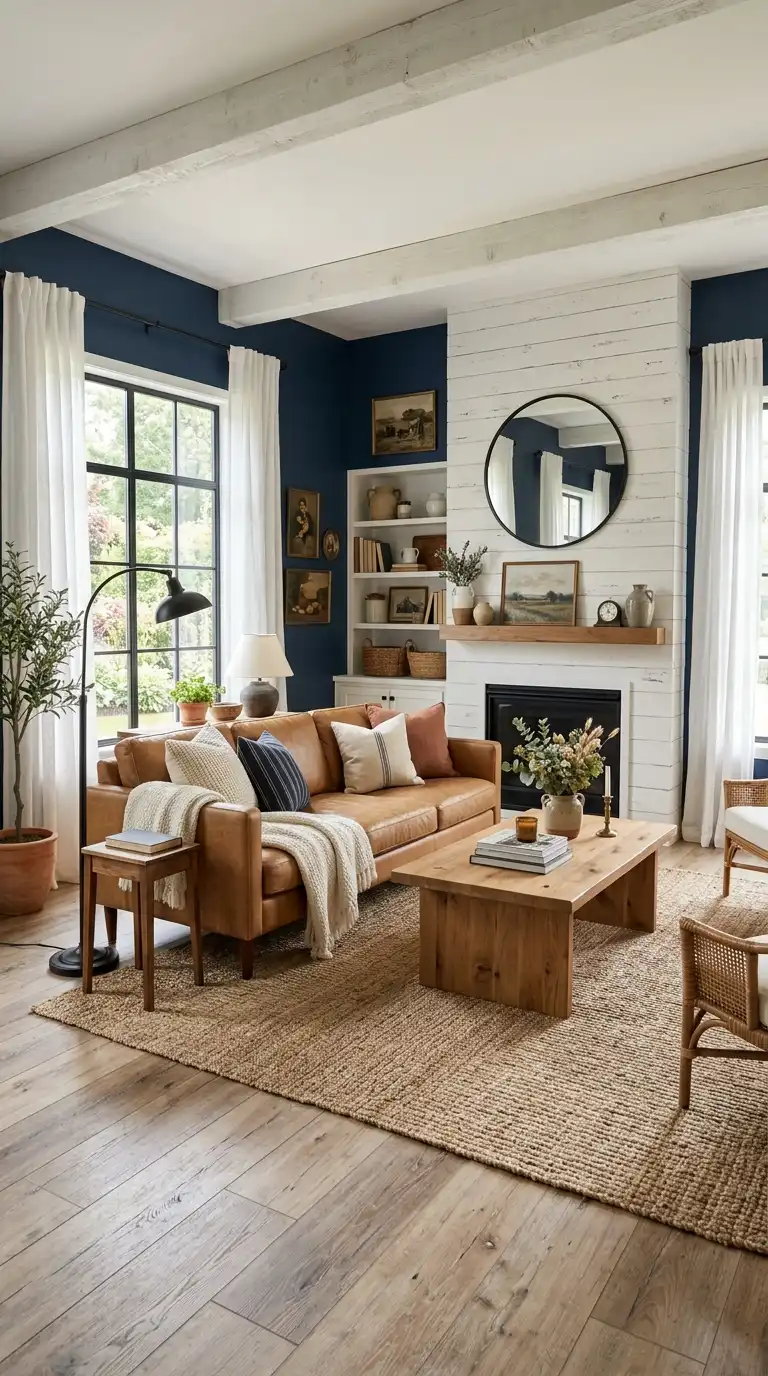 Blue and tan create a warm, inviting modern farmhouse palette. Use navy blue on walls or a sofa, and pair with tan leather furniture, natural wood accents, and white trim. Add vintage-inspired accessories, woven baskets, and galvanized metal accents to enhance the farmhouse aesthetic. The combination feels grounded, authentic, and perfectly suited for spaces that celebrate rustic charm with a touch of modern refinement. A jute rug and linen curtains complete the relaxed, inviting look.