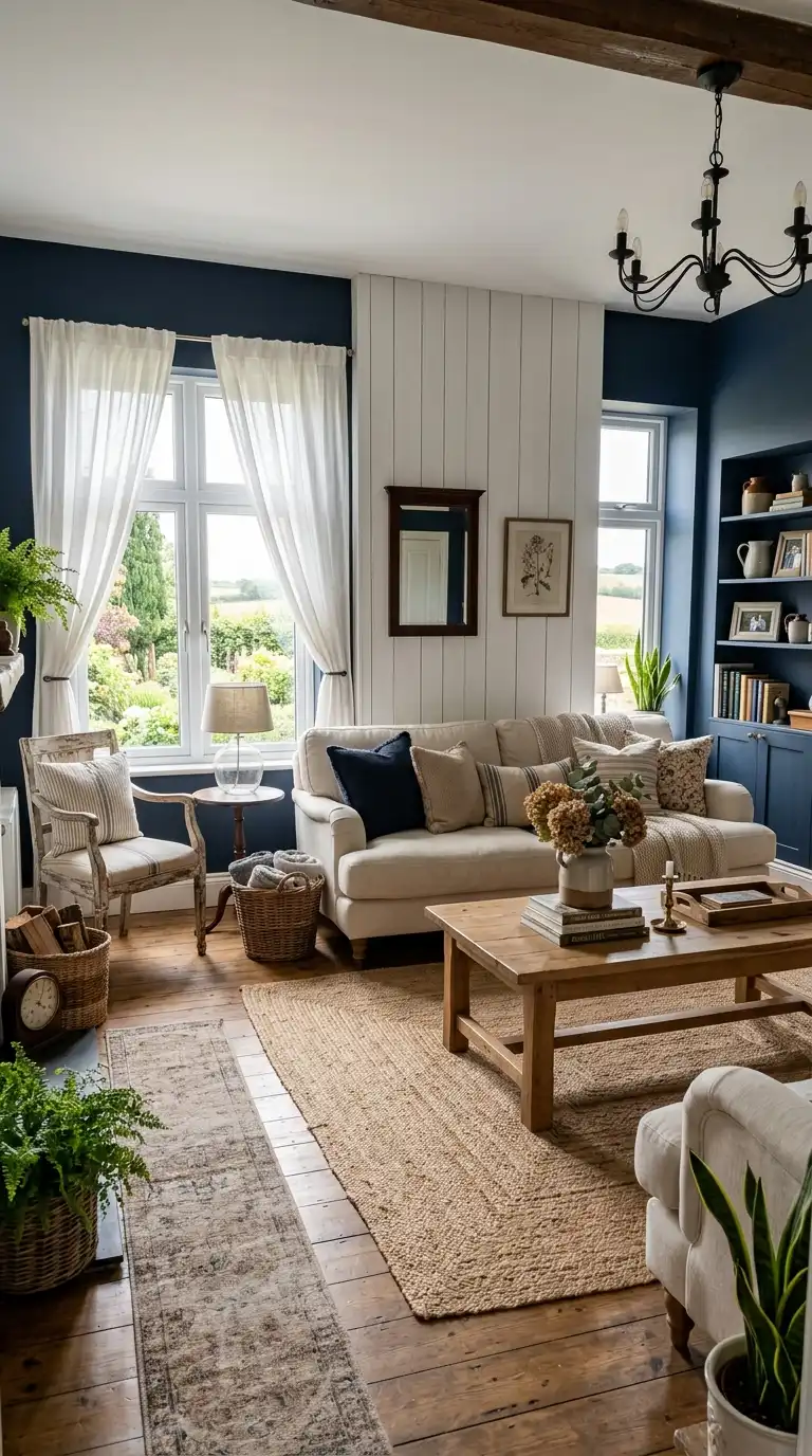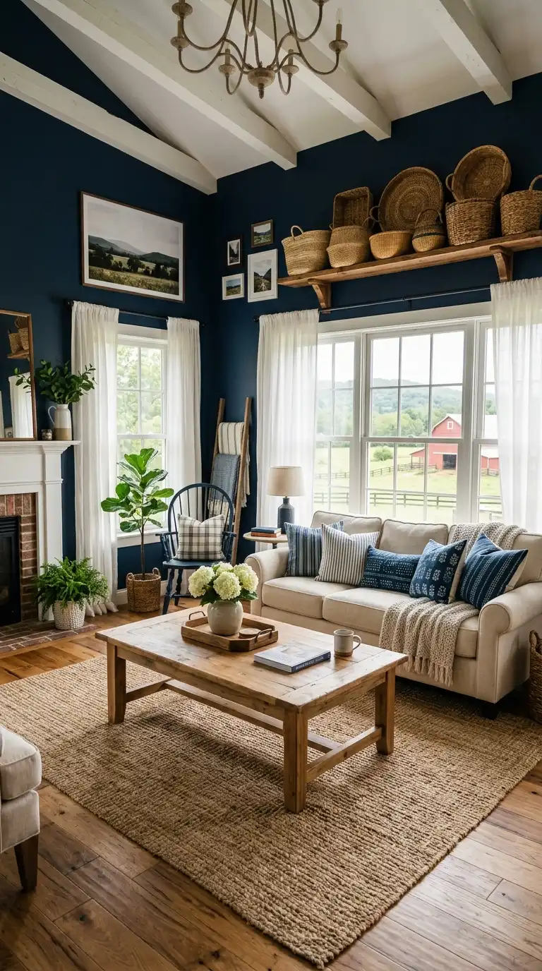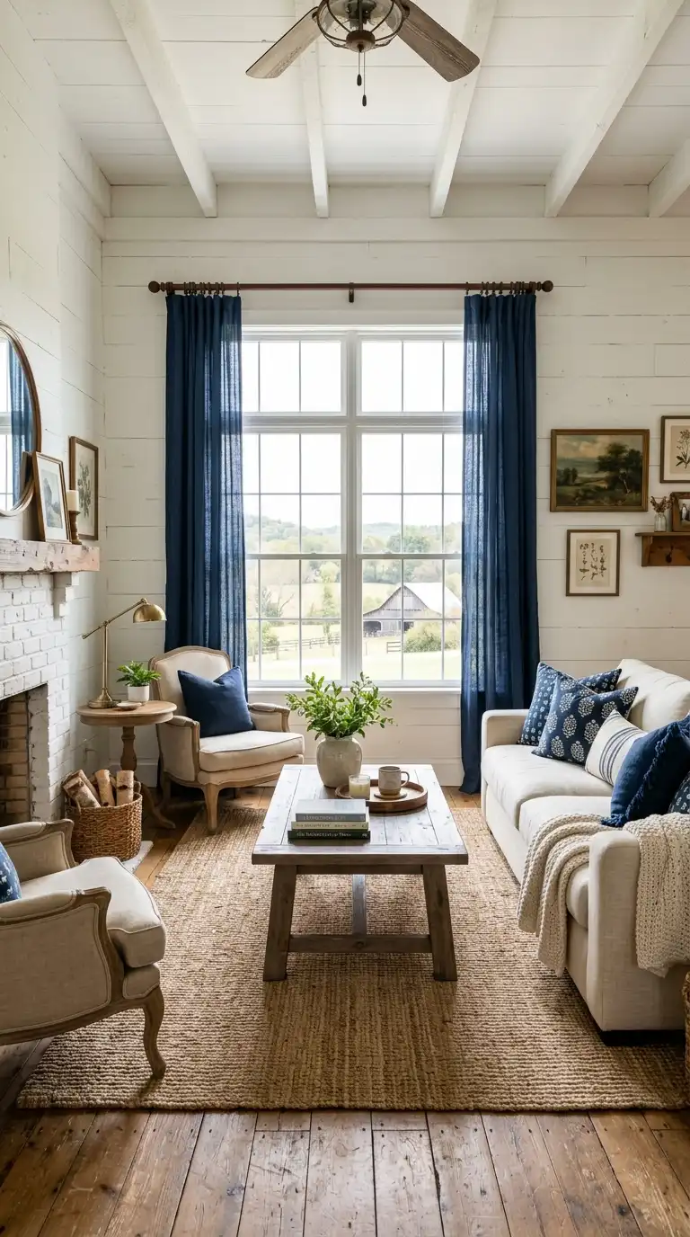 Yes. Navy blue and royal blue can work beautifully in farmhouse interiors when balanced with plenty of white, natural wood, and vintage accessories. A navy blue shiplap wall or navy blue curtains add drama while maintaining farmhouse charm. - What type of curtains work best in a blue and white farmhouse living room?