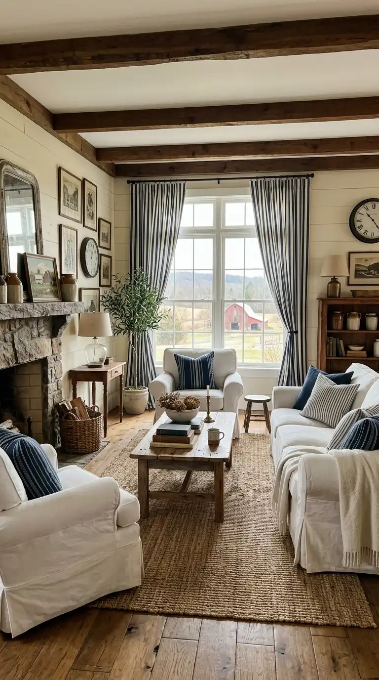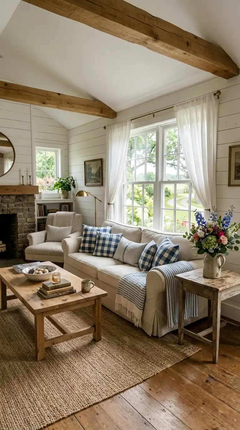 Linen curtains in white, cream, or navy add relaxed texture. Blue and white striped or checkered curtains bring classic farmhouse pattern. Sheer white curtains keep the space feeling light and airy. - How do I add farmhouse character to a blue and white living room?