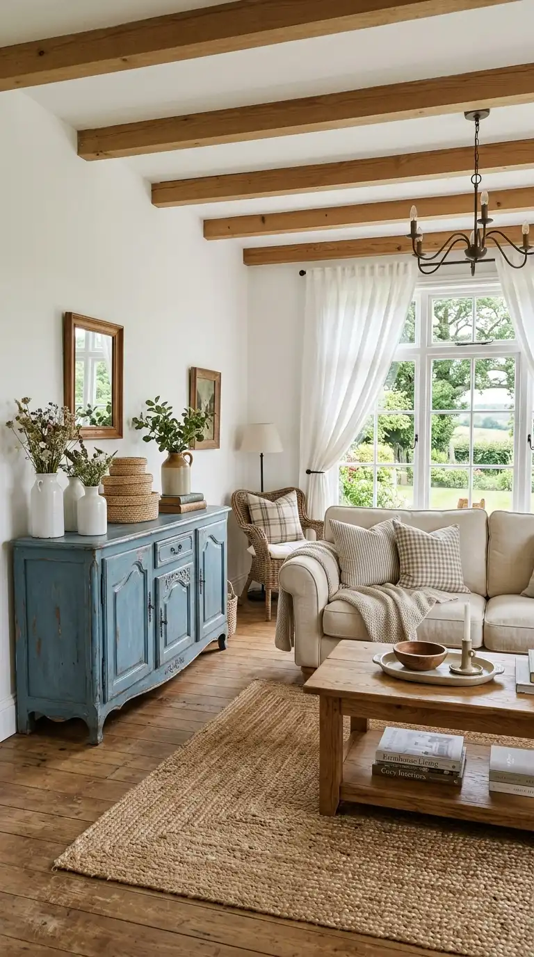 Slipcovered furniture in white or cream is a farmhouse staple, offering casual comfort and easy maintenance. Pair slipcovered sofas and armchairs with blue accents—throw pillows, curtains, a painted sideboard—for a classic blue and white farmhouse look. The slipcovers add softness and a relaxed feel, while the blue provides color and personality. Natural wood furniture, jute rugs, and vintage accessories complete the aesthetic, creating a space that feels comfortable, inviting, and timeless.