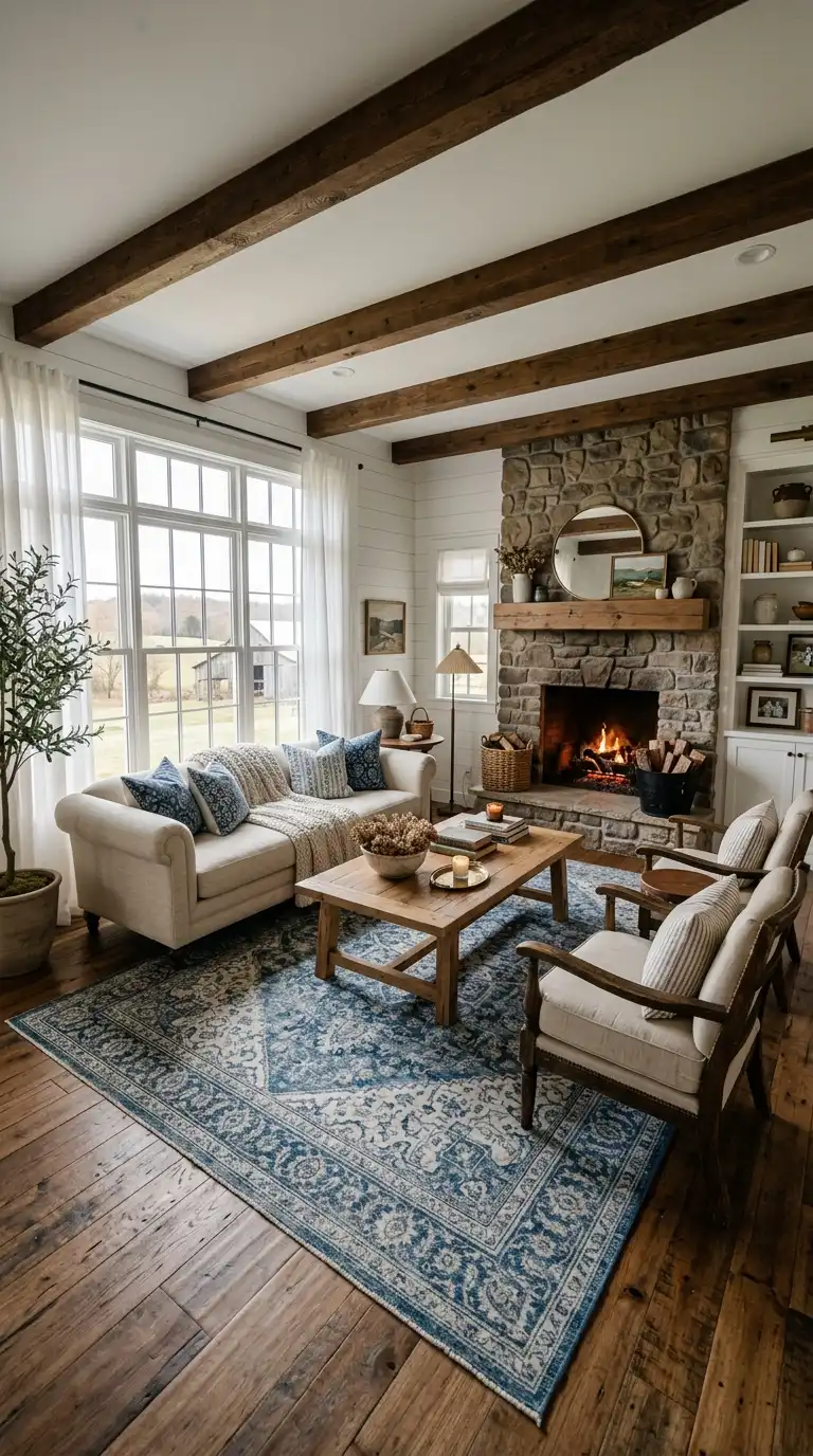 A vintage Persian or kilim rug in blue and white adds pattern, texture, and farmhouse charm to a living room. The worn, faded quality of a vintage rug feels right at home in farmhouse interiors, adding a sense of history and authenticity. Pair with neutral furniture—a cream sofa, beige armchairs—to let the rug take center stage. Natural wood accents and woven textures enhance the rustic feel, while white walls keep the space bright and open.