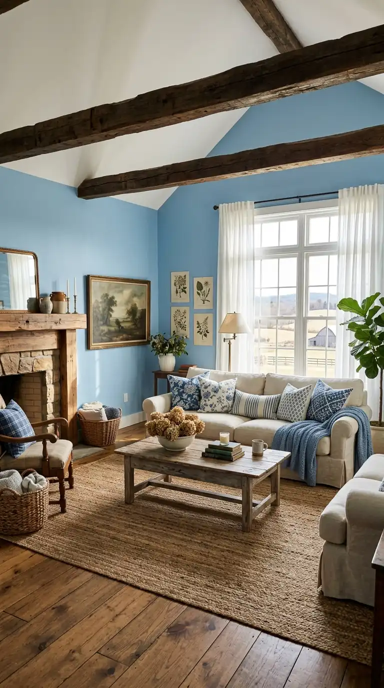 Combine blue and white with weathered wood finishes for an authentic farmhouse aesthetic. Use wood in coffee tables, shelving, ceiling beams, or accent walls to add warmth, texture, and rustic character. Blue can be introduced through walls, furniture, or textiles, while white provides crisp contrast. This combination feels grounded, organic, and deeply connected to farmhouse tradition. Weathered wood tones complement both navy and soft blue, making this palette versatile and timeless.