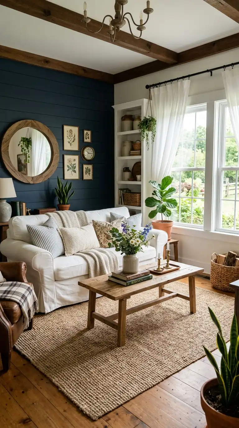 Navy blue walls paired with a white shiplap accent wall create a classic farmhouse look with striking contrast. The deep blue adds richness and drama, while the white shiplap brings texture, brightness, and rustic charm. This combination works beautifully as a focal point behind a sofa or fireplace. Pair with natural wood furniture, a jute rug, and vintage-inspired accessories to complete the farmhouse aesthetic. White sheer curtains allow natural light to filter through, softening the intensity of the navy.