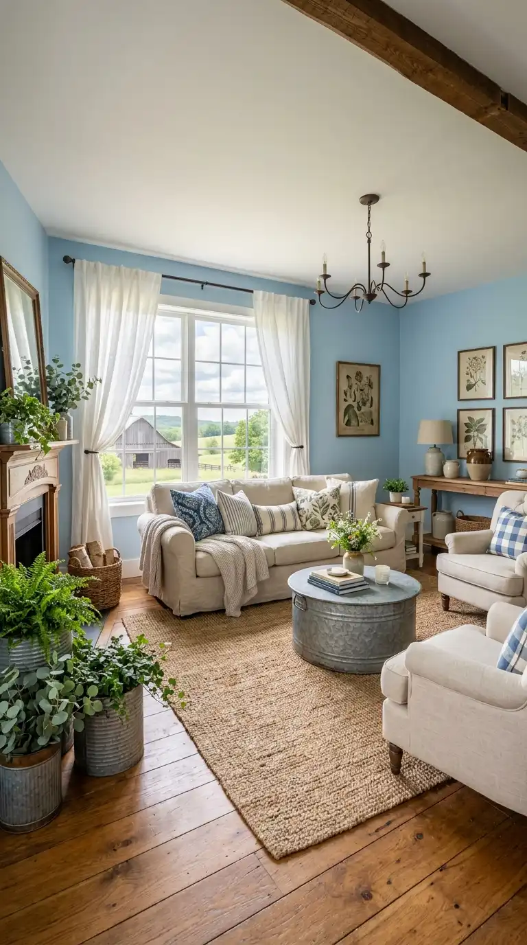 Galvanized metal accents add farmhouse authenticity to a blue and white living room. Use metal in planters, trays, buckets, or lighting fixtures to introduce rustic, industrial charm. The cool grey of galvanized metal complements blue and white beautifully, adding texture and contrast. Pair with a blue sofa or blue walls, white furniture, and natural wood accents for a cohesive, farmhouse-inspired look. This combination feels both rustic and refined, perfect for modern farmhouse interiors.