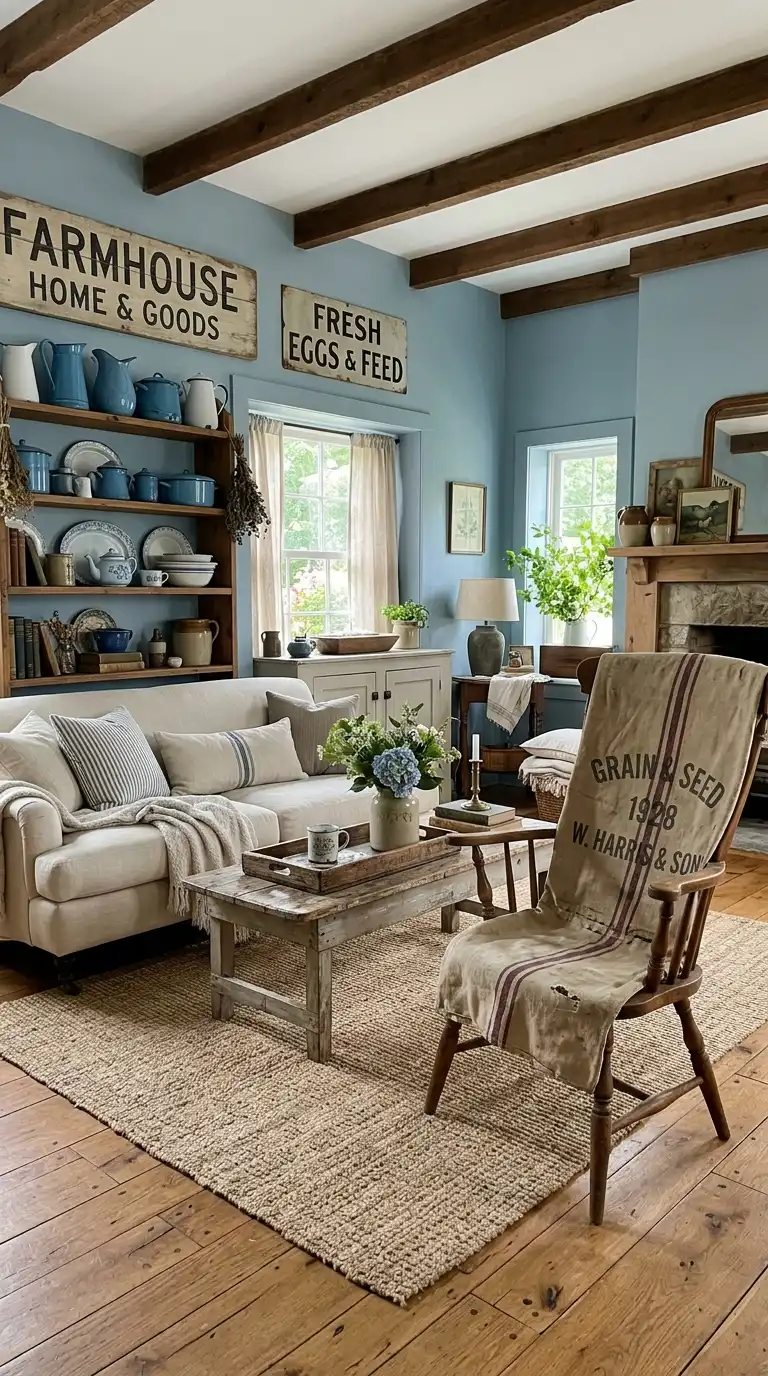 Incorporate vintage signs, antique finds, and farmhouse accessories to add personality and authenticity to a blue and white living room. Vintage enamelware, old grain sacks, rustic signs, and antique bottles in blue and white tones create a collected, lived-in feel. Arrange these treasures on open shelving, mantels, or side tables to tell a story and celebrate farmhouse heritage. Pair with a blue sofa or blue walls, white furniture, and natural wood accents for a cohesive, character-filled space.