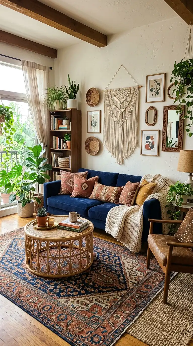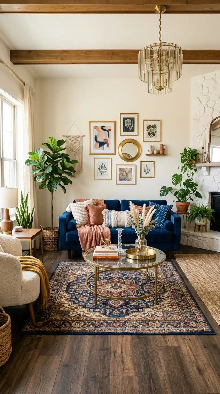 For a boho glam aesthetic, combine blue with gold accents. Use a blue velvet sofa, add gold-framed artwork, a brass coffee table, and gold decorative objects. Layer in textured pillows, a vintage rug, and plenty of greenery for a look that feels both luxurious and free-spirited.