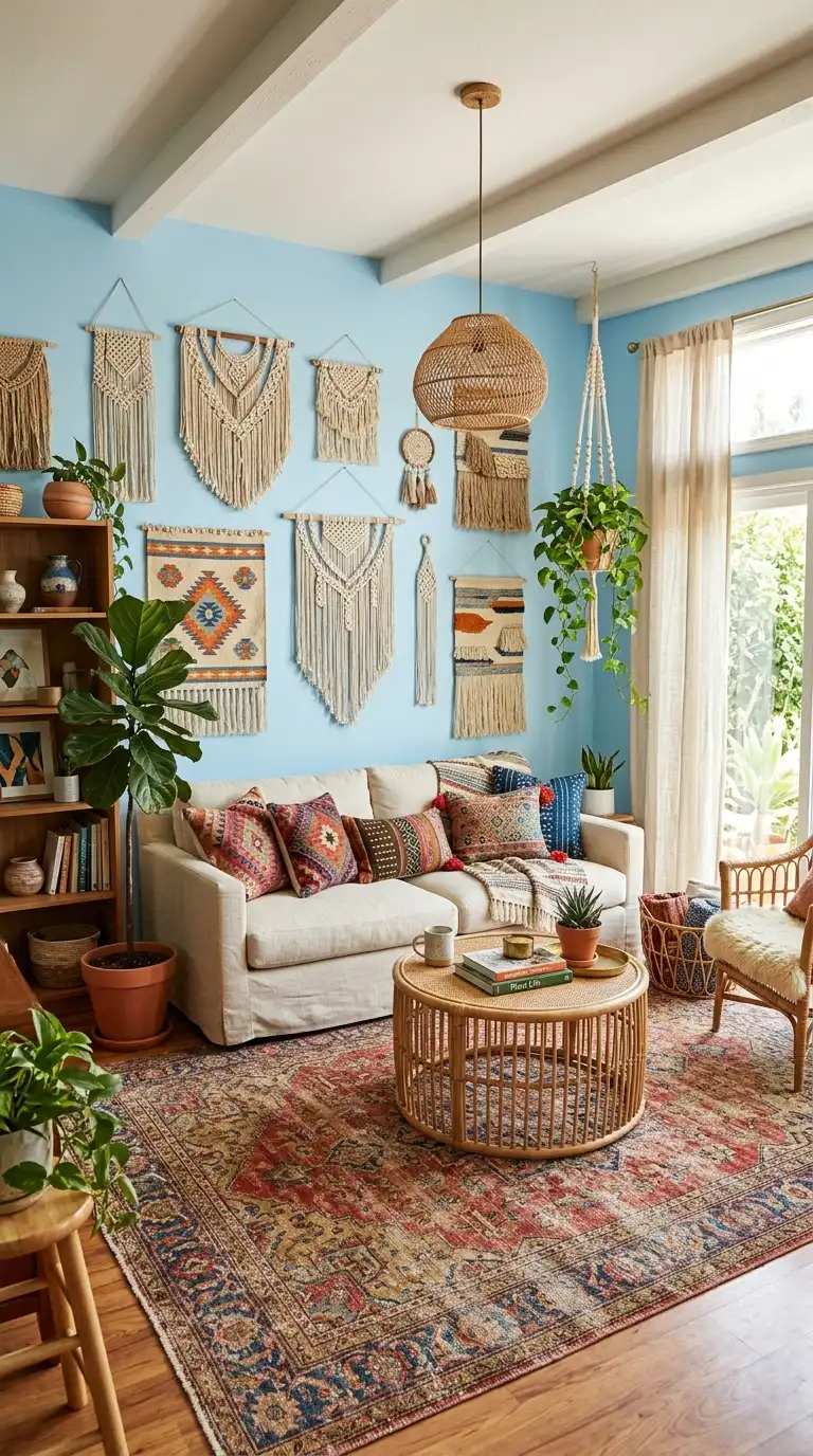 Use blue on a sofa, accent chairs, curtains, or a rug. Add blue through patterned pillows, throws, or artwork. Blue painted furniture or macrame also introduces the color in a boho-friendly way.