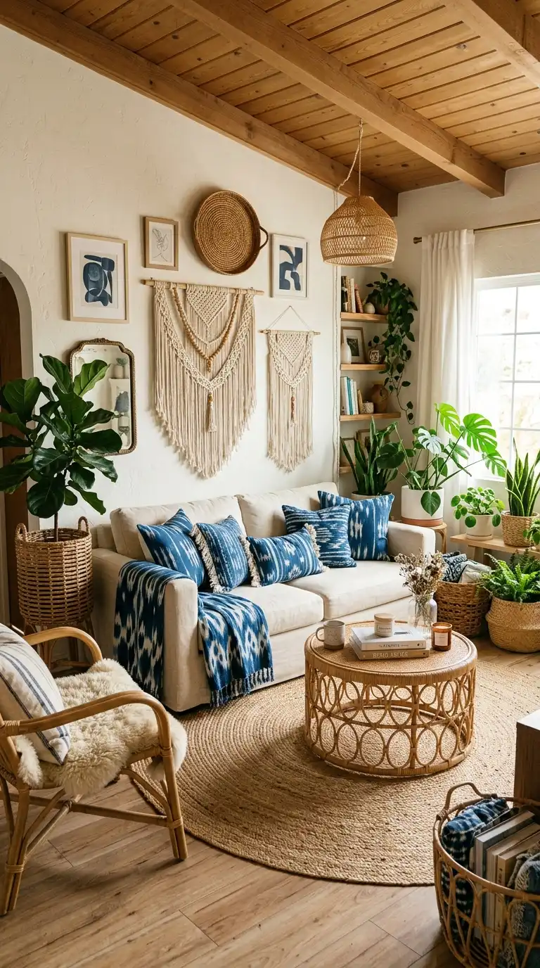 Ikat patterns in blue and white add global flair to a neutral boho living room. Use a cream or beige sofa as a foundation, and layer blue and white ikat pillows, a matching throw, and a patterned rug. Add rattan, wood, and plenty of greenery for organic texture.