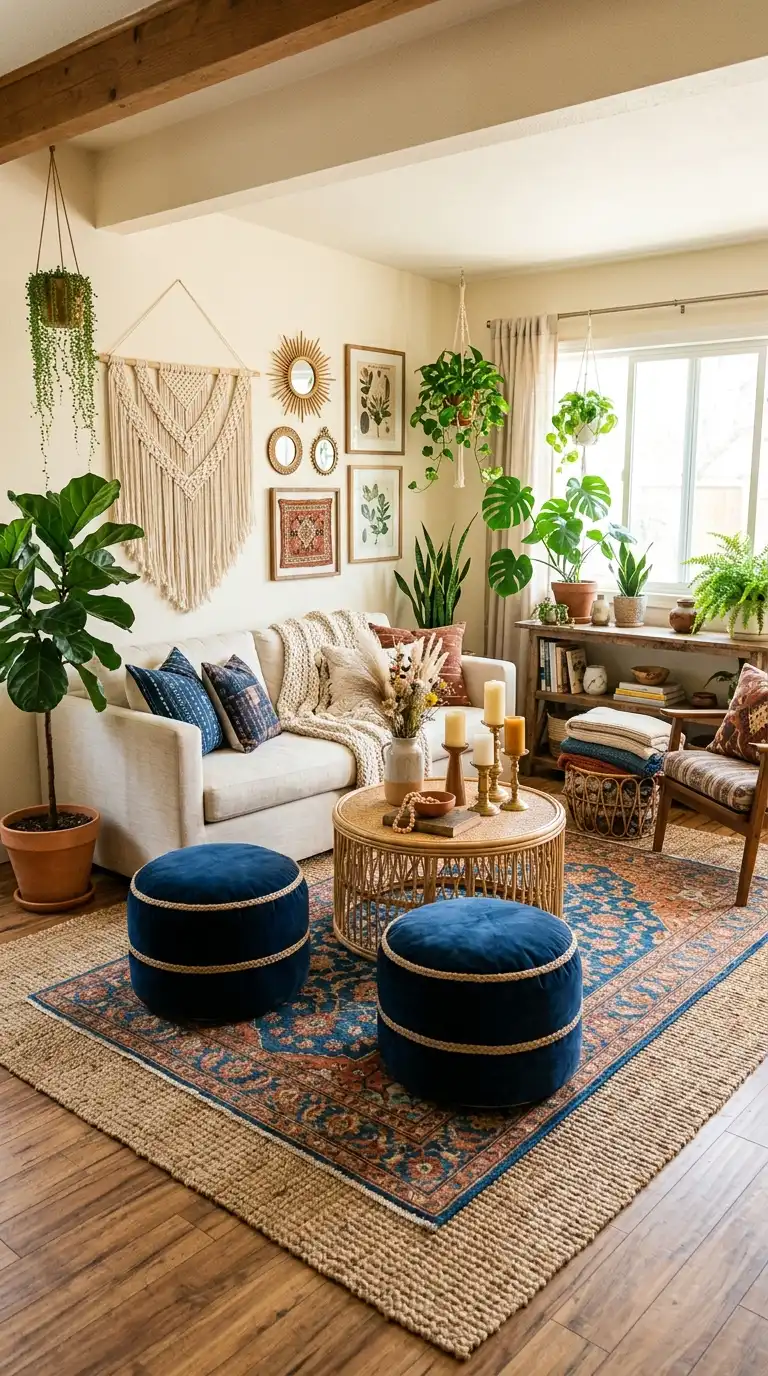 Blue velvet poufs add a pop of color and flexible seating to a boho living room. Layer them over a mix of rugs—a jute base with a vintage Persian or kilim on top. The poufs provide texture and color while adding to the relaxed, eclectic seating arrangement.