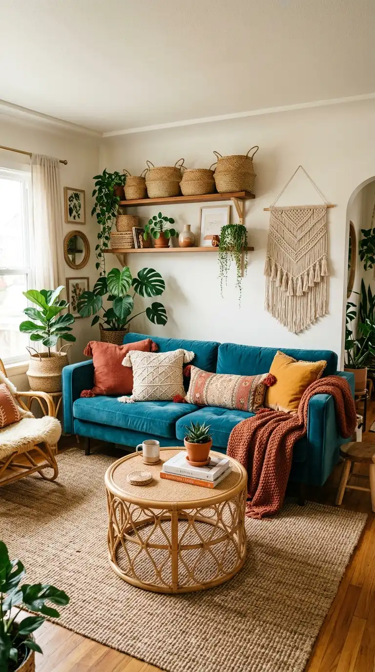 A teal blue velvet sofa brings rich color to a boho living room. Pair it with woven textures—a rattan coffee table, wicker baskets, and a jute rug—to enhance the organic, free-spirited feel. Add patterned pillows in warm earth tones and plenty of greenery.