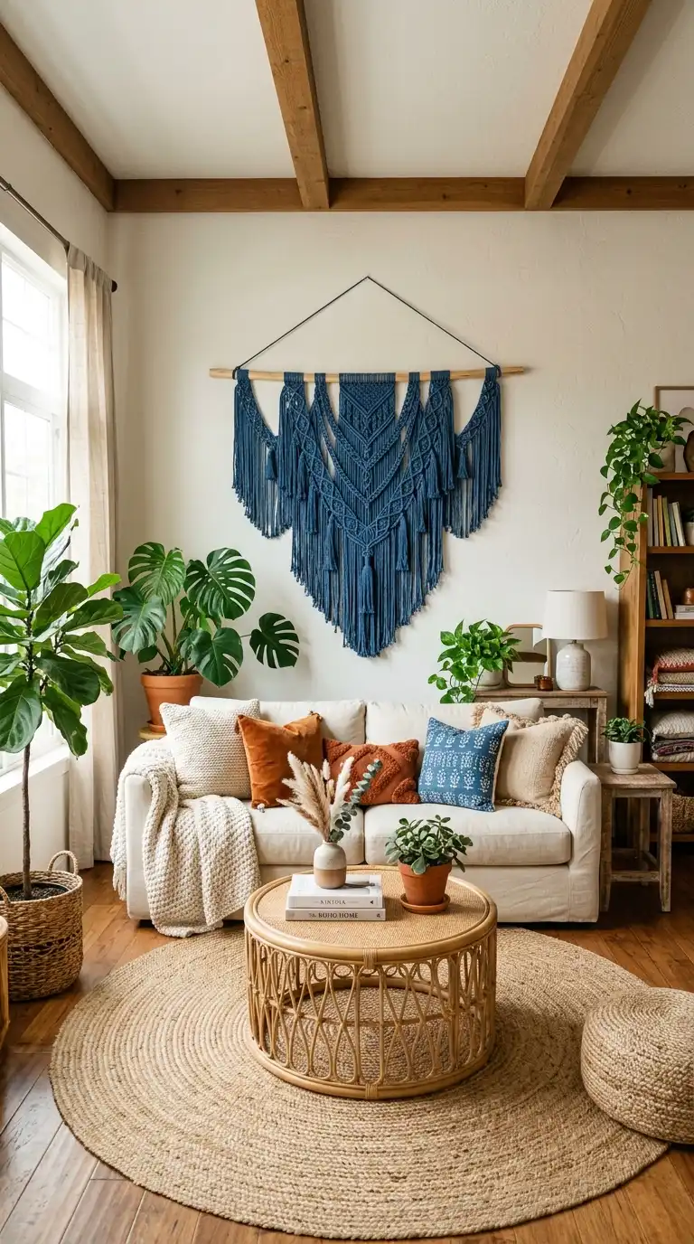 A large blue macrame wall hanging serves as a stunning focal point in a boho living room. Hang it above a neutral sofa, and layer in textured pillows, a jute rug, and plenty of greenery. The handcrafted piece adds artisanal charm and soft texture.