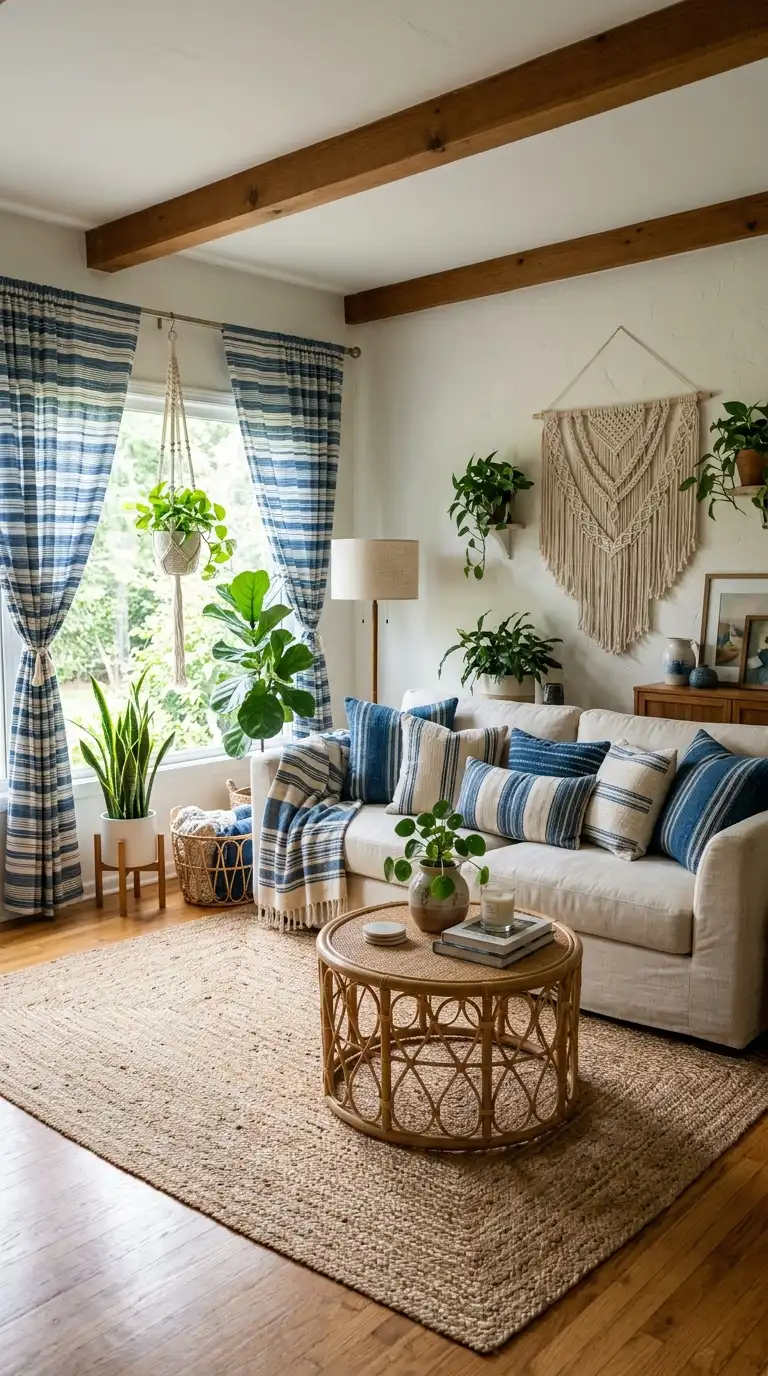 Blue and cream stripes add classic, graphic appeal to a boho living room. Use striped pillows, a striped throw, or even striped curtains to introduce pattern. Pair with natural textures—rattan, jute, wood—and layer in global accents like macrame and woven baskets.