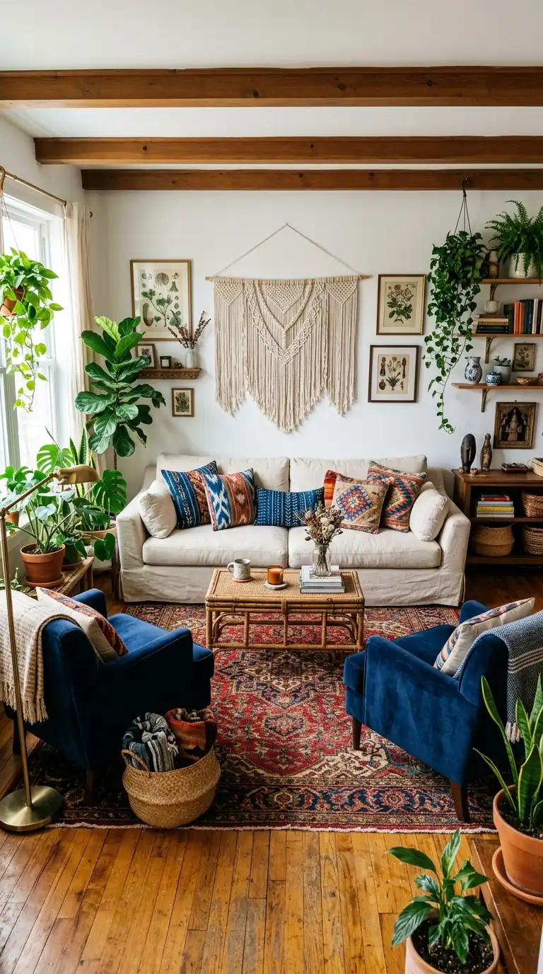 Blue velvet armchairs add a touch of luxury to a boho living room. Pair them with a neutral sofa, layer in colorful patterned pillows, and add a vintage rug. The rich blue provides a grounding element that balances the eclectic mix of patterns and textures.