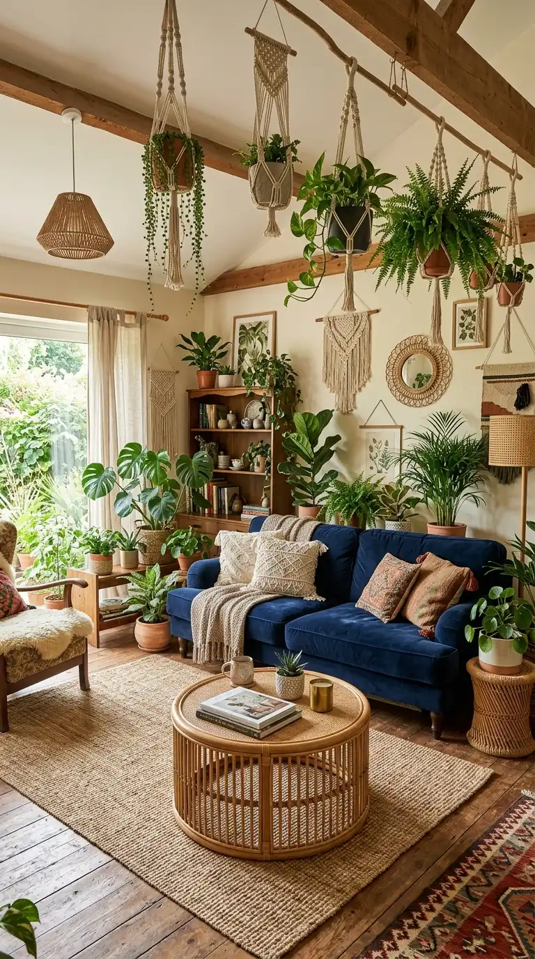 Combine blue with green for a bohemian palette inspired by nature. Use a blue sofa or blue walls, and layer in plenty of greenery—potted plants, hanging planters, and botanical prints. Add natural textures like rattan, jute, and wood for an organic, free-spirited feel.