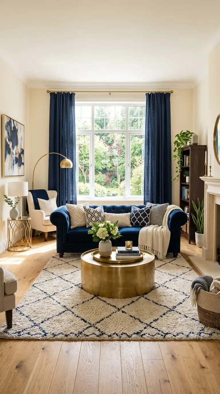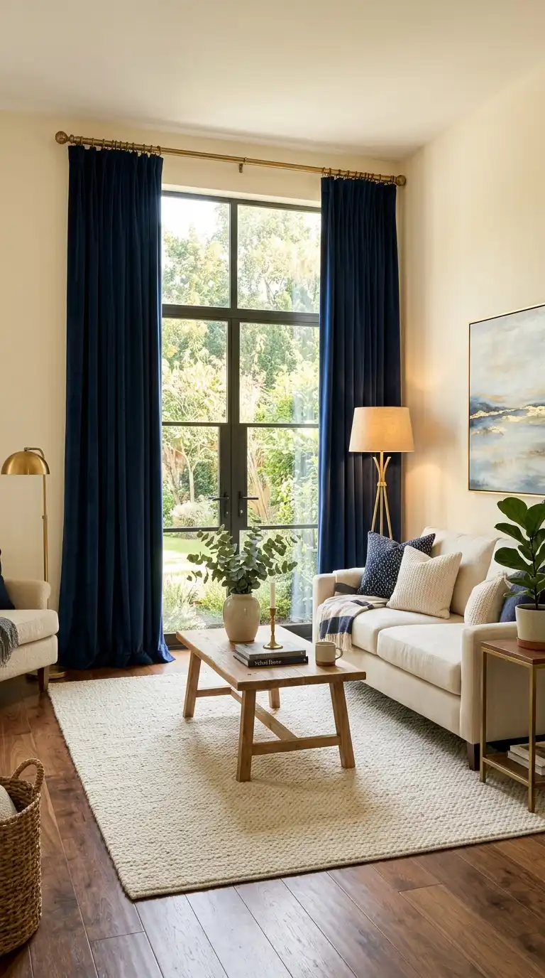 Navy blue velvet curtains add richness and drama to a living room. Pair them with cream walls and neutral furniture for a sophisticated, elegant look. The plush texture of velvet enhances the luxurious feel, while brass or gold curtain rods add warmth and shine.
