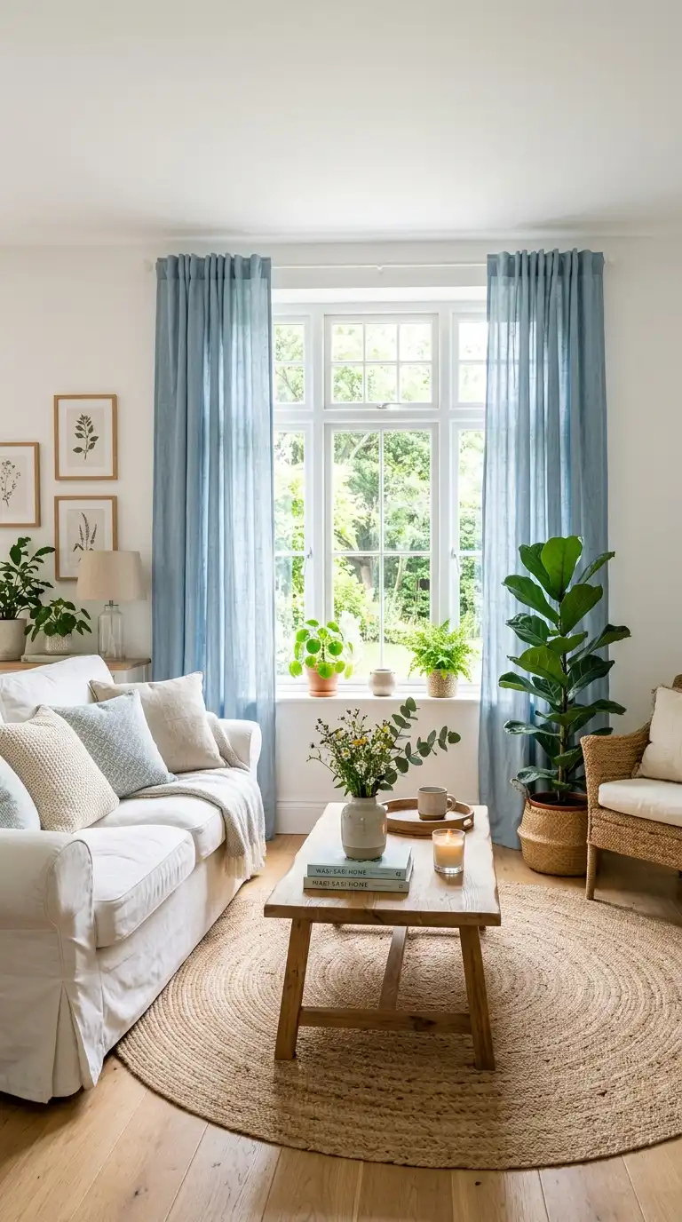 Light blue linen curtains bring a fresh, airy quality to a living room. Pair them with crisp white walls and natural wood accents for a Scandinavian-inspired aesthetic. The lightweight fabric allows soft light to filter through, creating a bright, serene atmosphere.