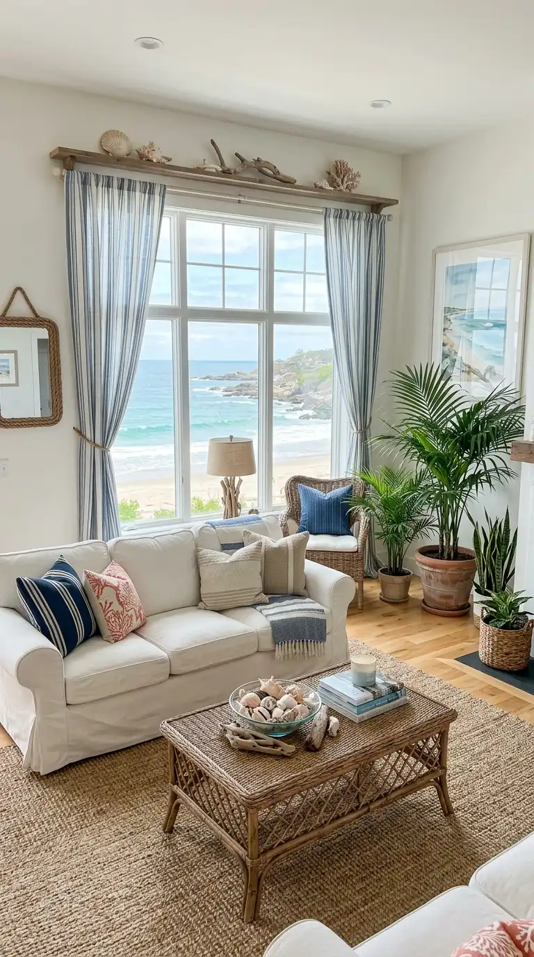Blue and white striped curtains add classic, nautical charm to a coastal-inspired living room. Pair them with white slipcovered furniture, rattan accents, and natural textures like jute and linen. The vertical stripes draw the eye upward, making ceilings appear higher.