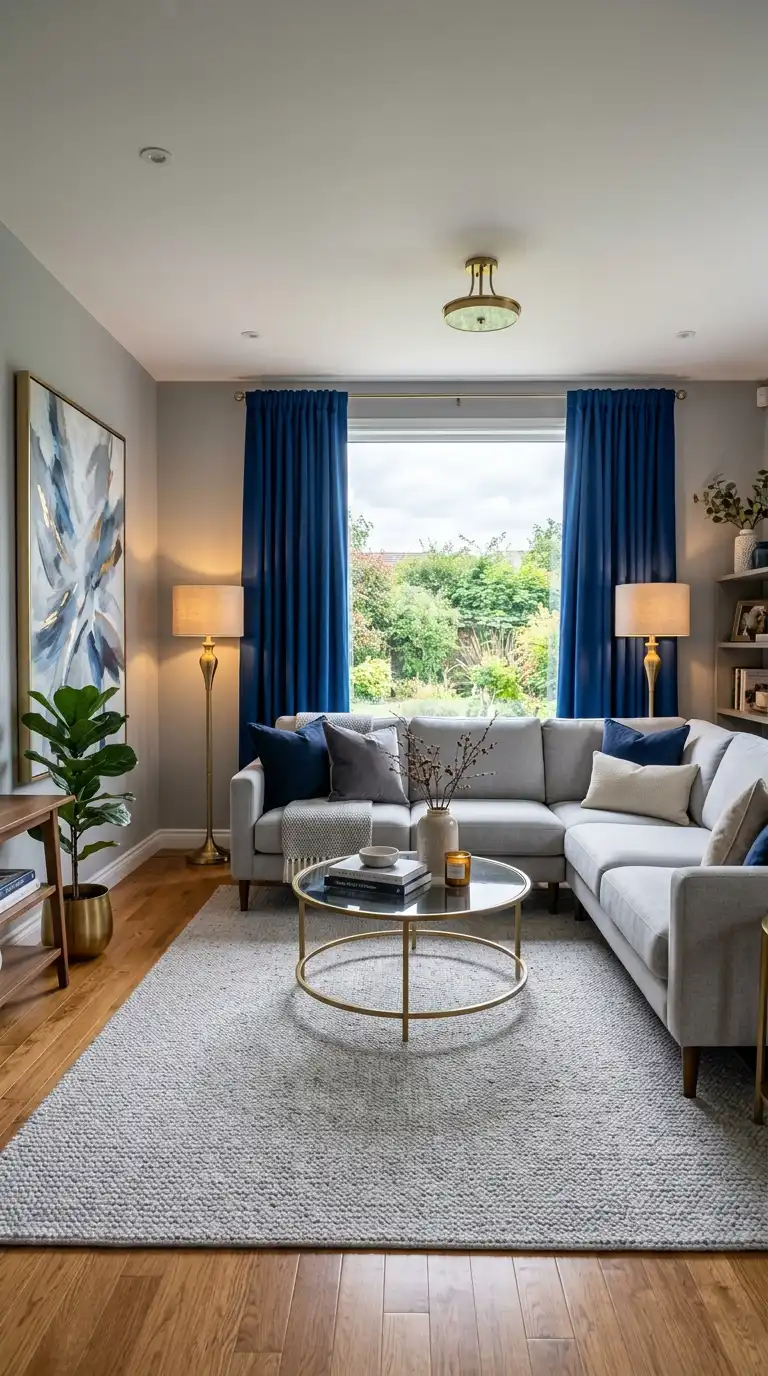 Royal blue curtains add bold, vibrant energy to a living room. Pair them with soft gray walls, a light gray sectional, and brass accents for a modern, sophisticated look. The high contrast between the blue curtains and gray walls creates a striking focal point.