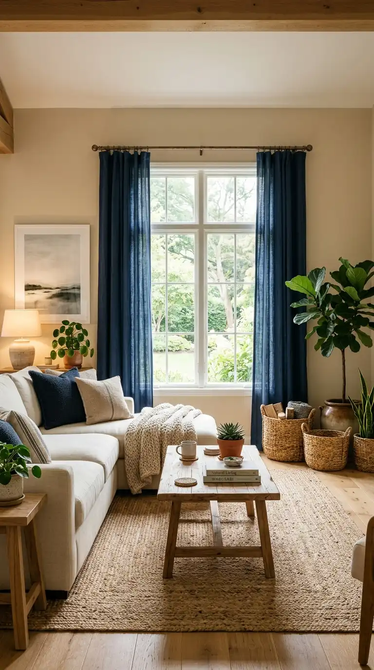 Navy blue curtains paired with warm beige walls create a grounded, inviting space. The deep blue adds richness while the beige provides warmth. Natural wood furniture and woven textures enhance the organic feel, and brass accents add a touch of elegance.