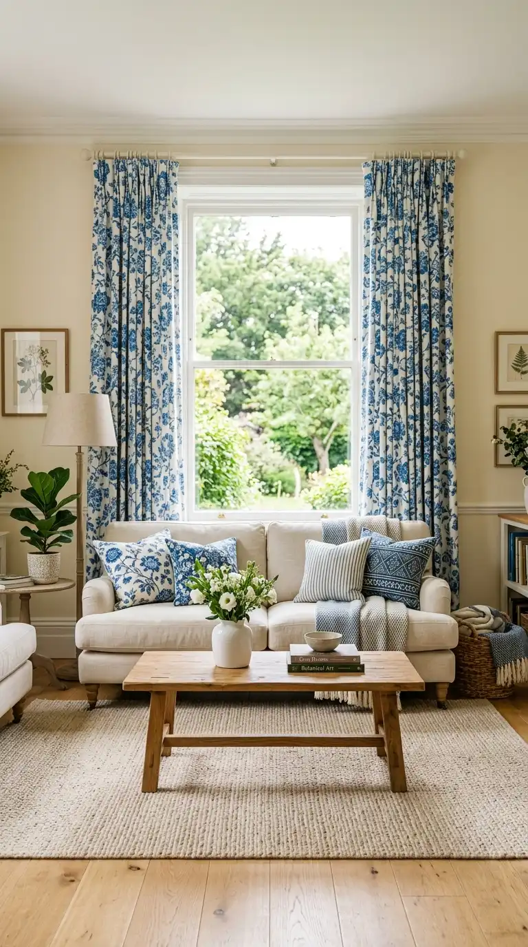 Patterned curtains in blue and white—whether floral, geometric, or traditional—add visual interest and serve as a focal point. Keep the rest of the room neutral with a cream or gray sofa, and pull accent colors from the pattern into pillows and accessories for a cohesive look.