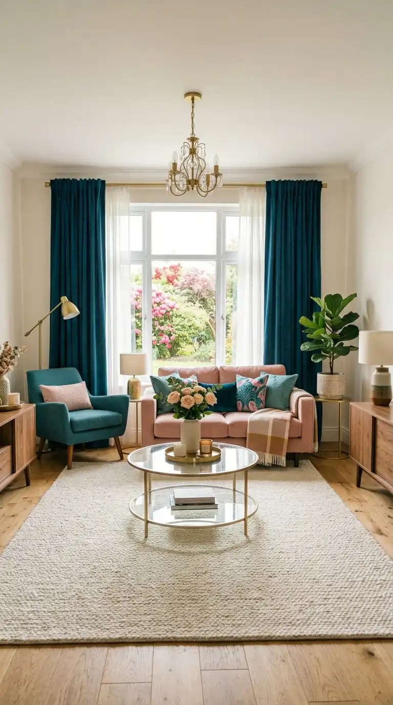 Teal blue curtains bring a rich, jewel-toned depth to a living room. Pair them with blush pink accents in pillows, throws, or artwork for an unexpected, sophisticated palette. Gold or brass accents enhance the warmth and elegance of the combination.