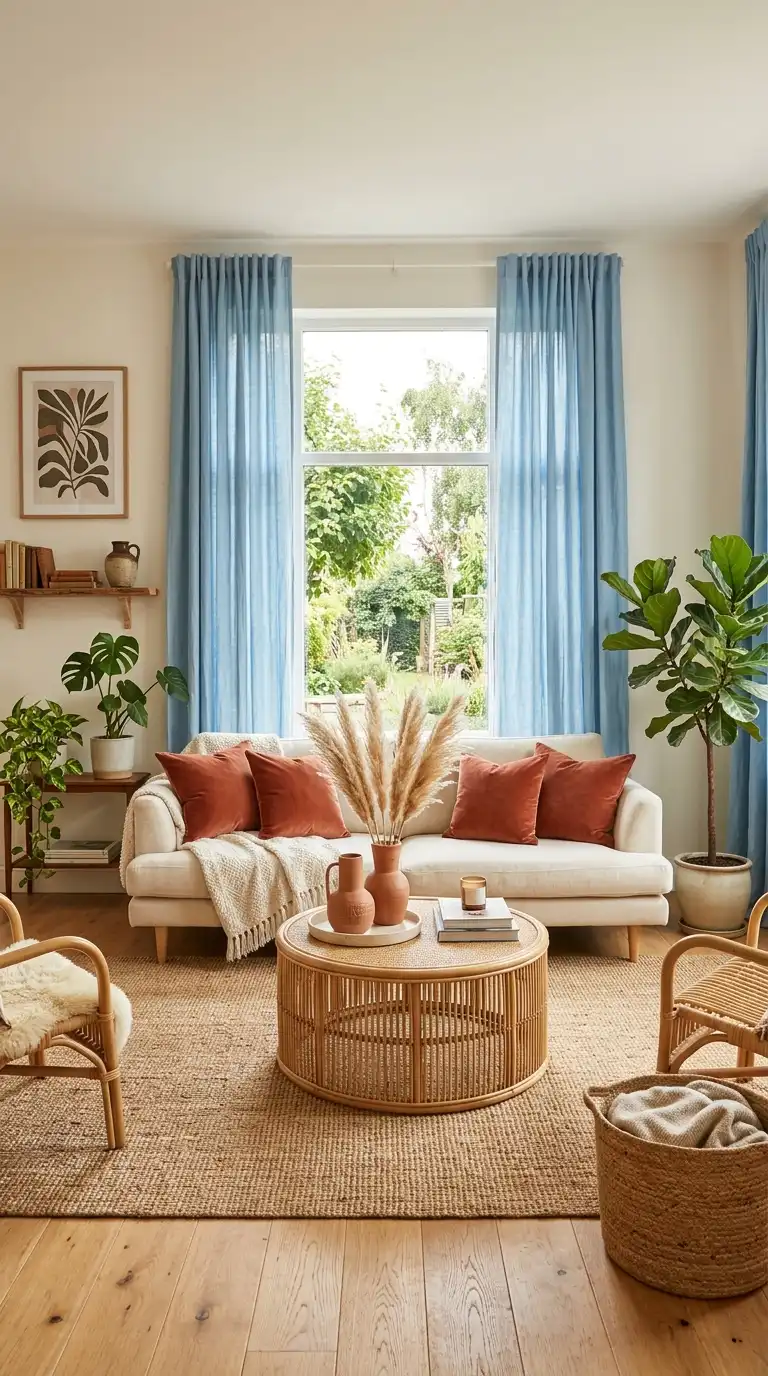 Sky blue curtains paired with terracotta accents create a warm, Mediterranean-inspired palette. The cool blue balances the earthy warmth of terracotta, resulting in a space that feels both serene and inviting. Use terracotta in pillows, vases, or a clay pot.