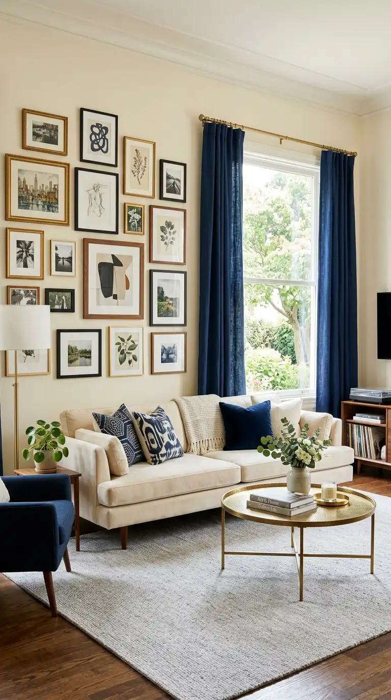 Navy blue curtains provide a dramatic backdrop for a gallery wall of artwork. The deep blue makes frames and artwork stand out, creating a sophisticated, gallery-like atmosphere. Use a mix of frame finishes—gold, black, and wood—for visual interest.
