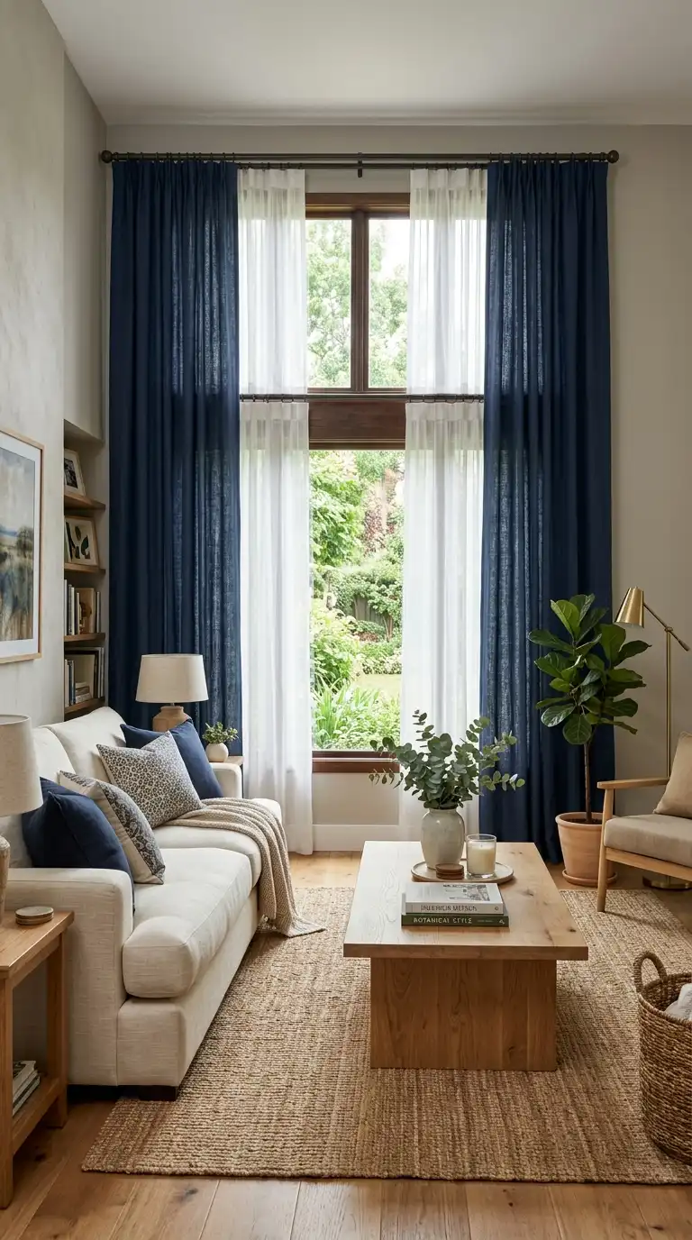 Layering blue curtains over sheer white panels adds depth, texture, and light control. The sheers provide softness and privacy during the day, while the blue curtains can be drawn for drama and light blocking in the evening. This combination works in both traditional and contemporary spaces.