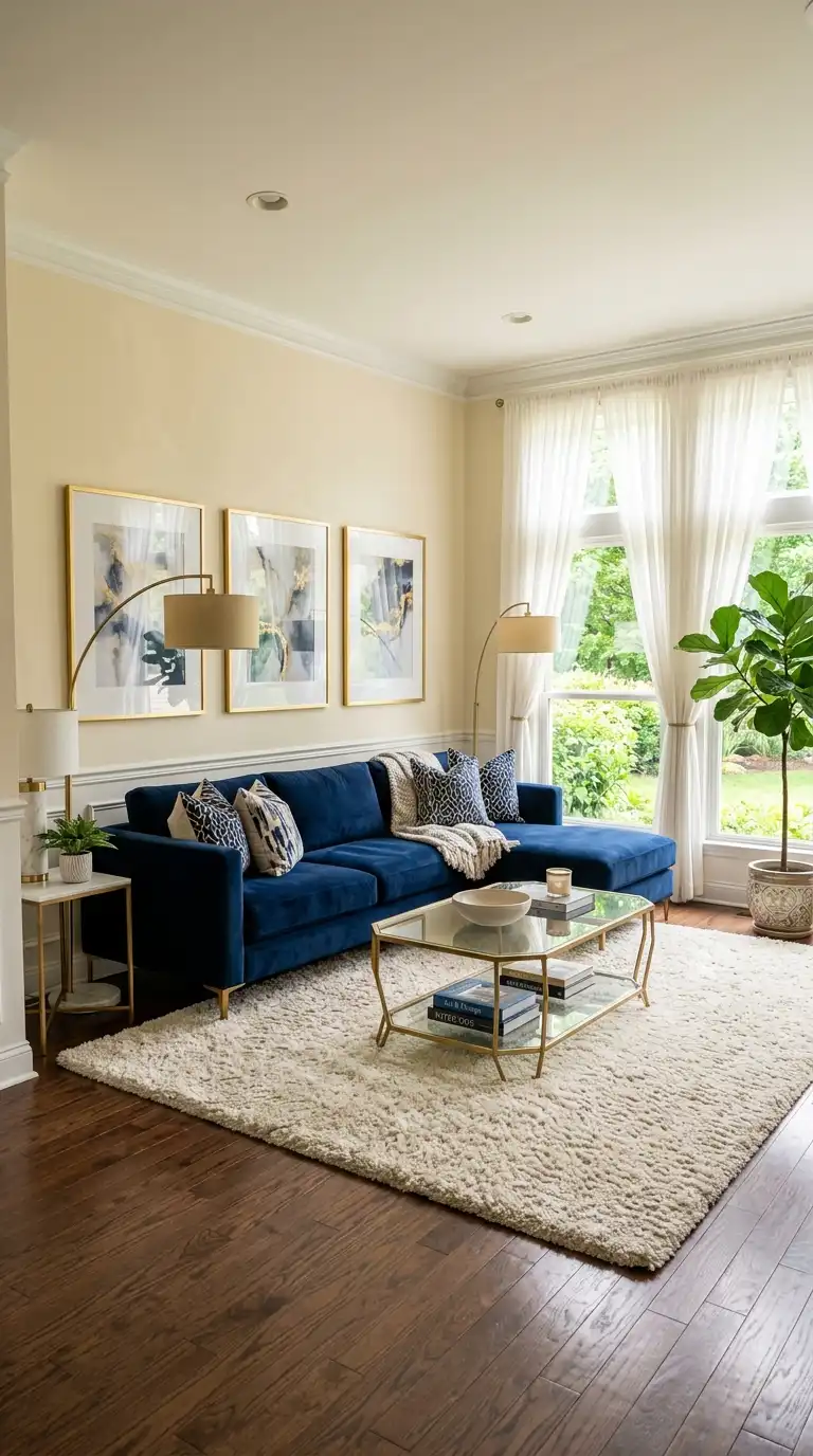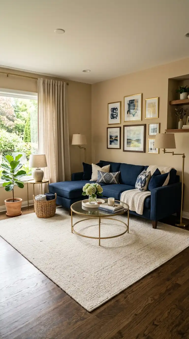 A navy blue sectional paired with warm beige walls and brass accents creates a sophisticated, inviting space. The deep blue grounds the room while beige adds warmth, and brass in lighting, coffee tables, and picture frames adds a touch of elegance. A cream area rug and linen curtains complete the balanced, timeless look.