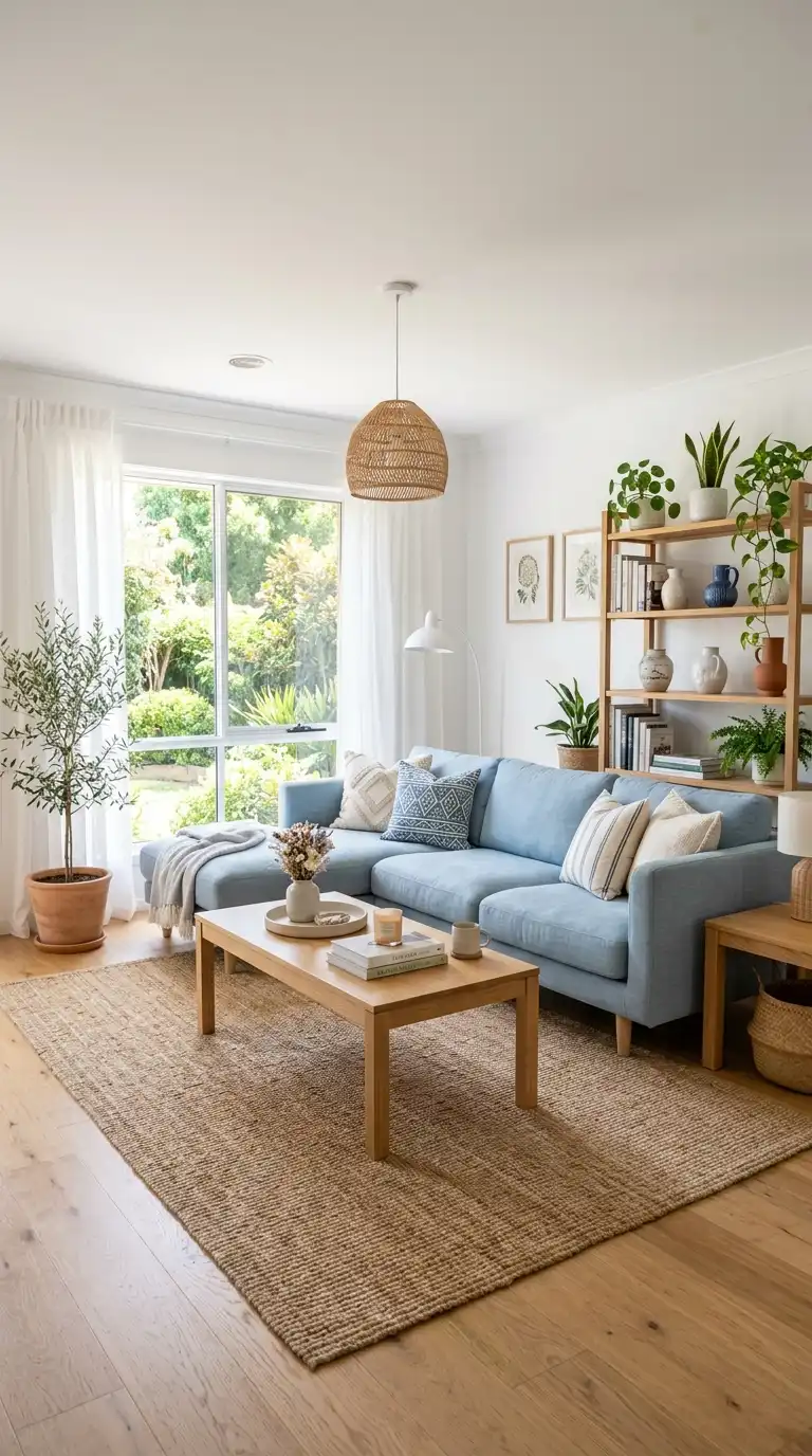 A light blue linen sectional brings a fresh, airy quality to any living room. Pair it with crisp white walls, a natural wood coffee table, and a jute rug for a Scandinavian-inspired aesthetic that feels clean, bright, and effortlessly stylish. White sheer curtains allow natural light to flood the space, enhancing the open, serene atmosphere.