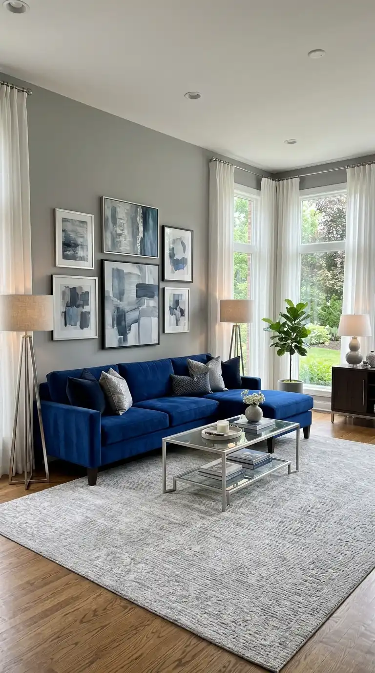 A royal blue sectional adds bold, vibrant energy to a living room. Pair it with gray walls, a silver metal coffee table, and a light gray area rug for a cool, contemporary palette that feels sleek and modern. Abstract art in blue and gray and silver floor lamps complete the polished, urban aesthetic.