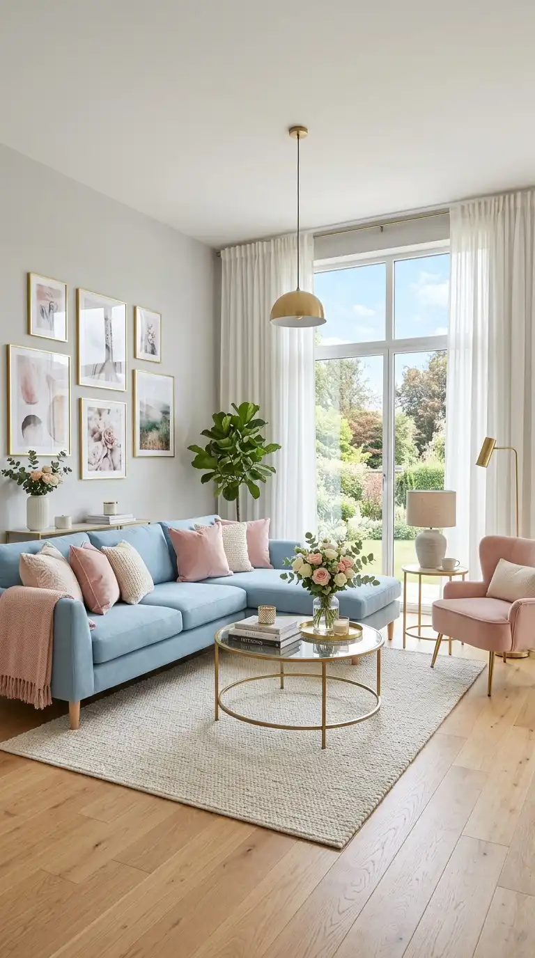 A sky blue sectional provides a soft, serene foundation that pairs beautifully with blush pink accents. The cool blue and warm pink create a romantic, inviting palette that feels fresh and modern. Introduce blush through throw pillows, a velvet armchair, or artwork, and add gold accents in lighting and coffee tables for warmth and elegance.