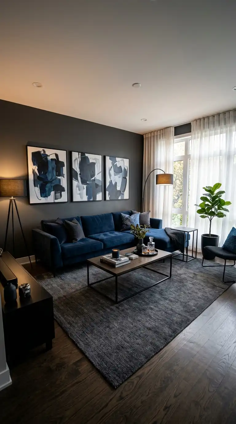 A dark blue sectional paired with charcoal gray walls and black accents creates a moody, dramatic palette that feels sophisticated and intimate. The deep tones work harmoniously together, with the blue adding richness and the gray and black providing grounding contrast. Brass or gold accents add warmth and prevent the space from feeling too cold.