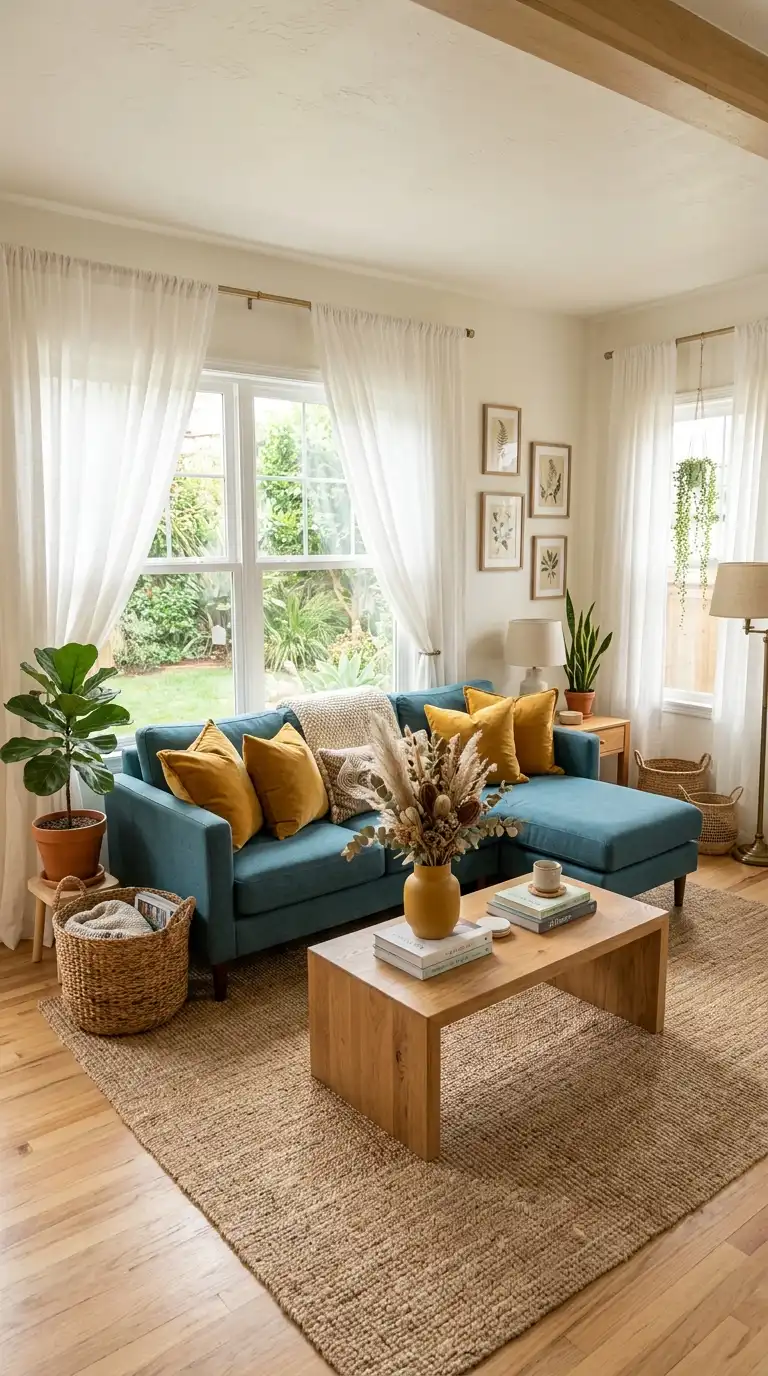 A teal blue sectional—sitting between blue and green—creates a vibrant, unexpected foundation. Pair it with mustard yellow accents in pillows or a throw, and natural wood furniture for warmth and organic texture. A jute rug and plenty of greenery enhance the grounded, eclectic feel.