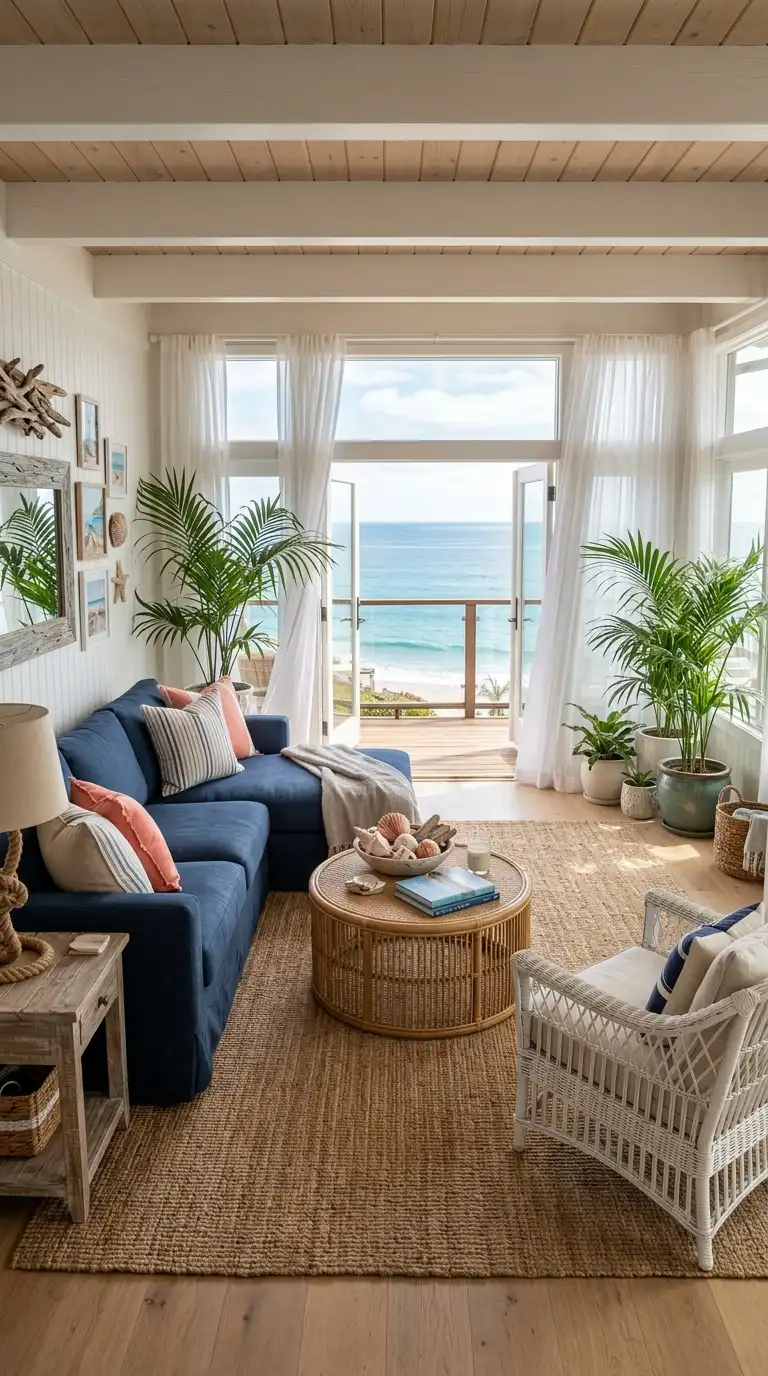 A navy blue sectional can anchor a coastal-inspired living room with ease. Pair it with white slipcovered chairs, a rattan coffee table, and a jute rug for a relaxed, breezy aesthetic. Add woven baskets, driftwood accents, and plenty of greenery to complete the beachy, inviting atmosphere.