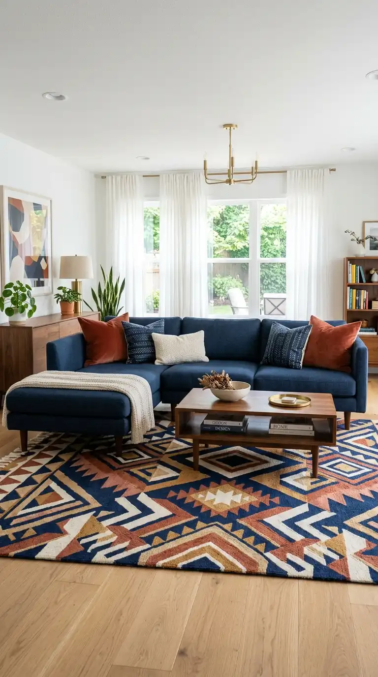 A blue sectional provides a versatile foundation for a bold geometric patterned rug. The rug becomes the focal point, with the sectional serving as a complementary backdrop. Pull accent colors from the rug—whether terracotta, blush, or mustard—into throw pillows and accessories for a cohesive, intentional design.
