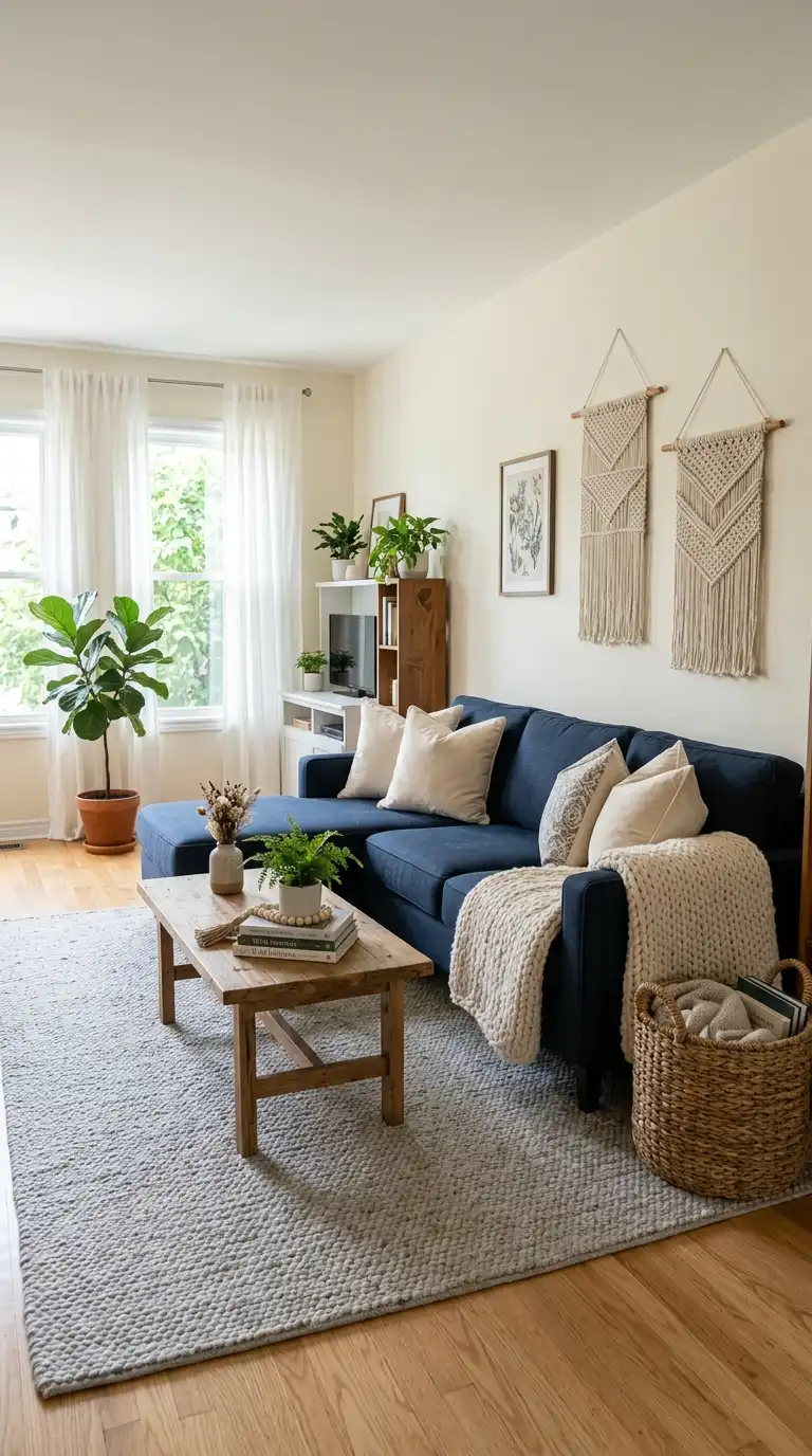 Layer textures around a blue sectional to create depth, warmth, and visual interest. Combine velvet pillows, a chunky knit throw, a wool area rug, woven baskets, and natural wood furniture for a rich, tactile experience. The blue sectional serves as a unifying element that allows the textures to shine without competing.