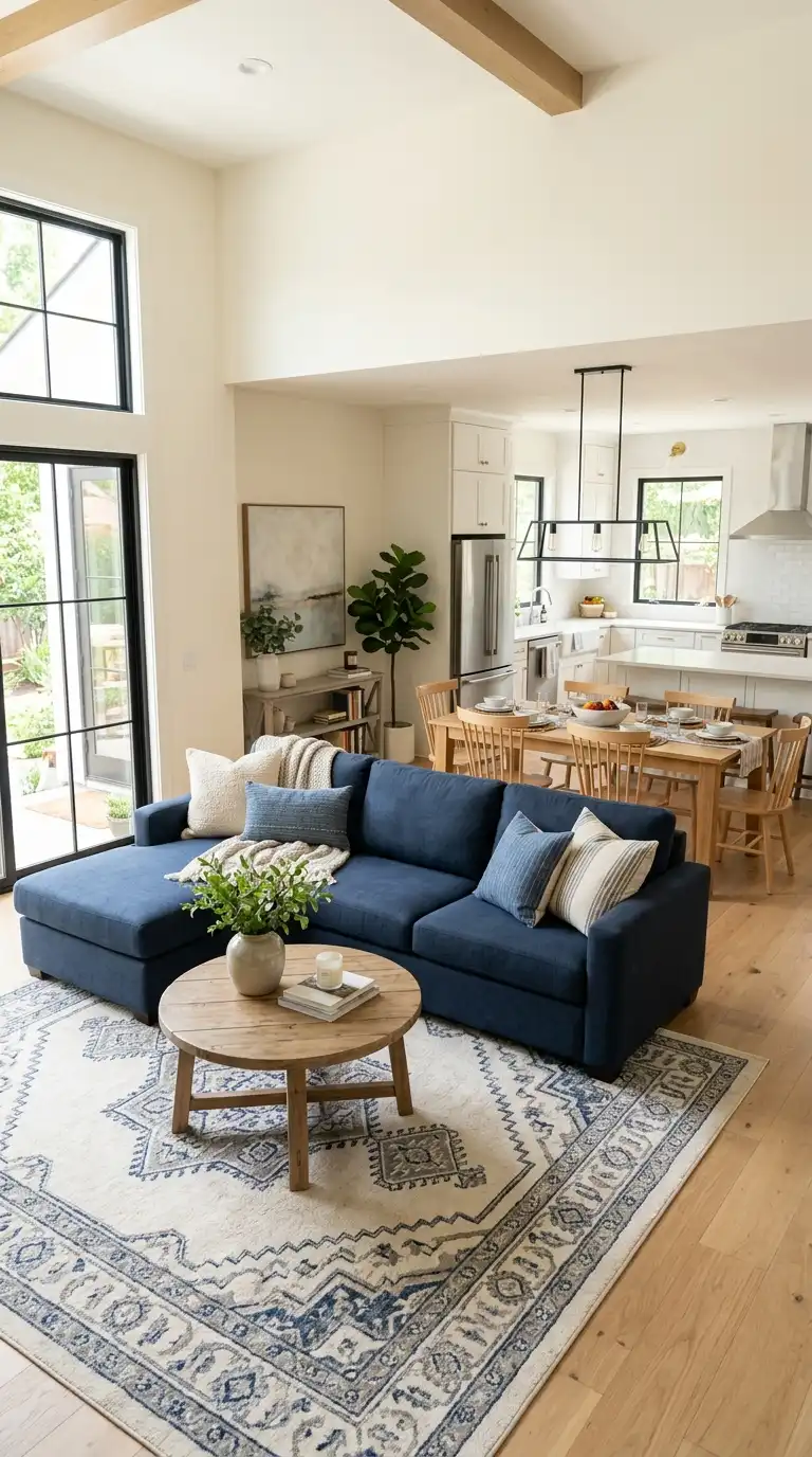 In open concept living spaces, a blue sectional serves as a functional anchor that defines the seating area while maintaining visual flow throughout the room. Choose a sectional in a versatile blue shade—like navy or medium blue—that complements adjacent kitchen or dining areas. Use a large area rug to define the living zone and add cohesion.
