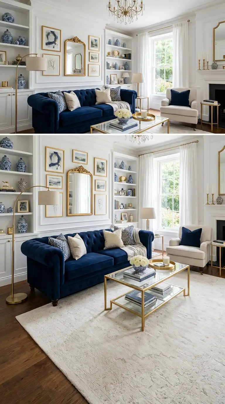 Navy blue, crisp white, and warm gold create one of the most classic and luxurious color combinations in interior design. The deep navy provides dramatic foundation, white adds brightness and contrast, and gold introduces warmth and glamour. This palette works beautifully in formal living rooms and spaces designed for elegance. Use white on walls and trim, gold through lighting and accessories, and let the navy sofa take center stage.