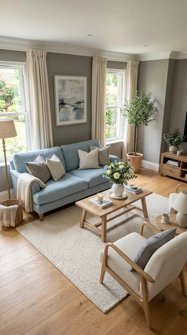 Powder blue, soft grey, and warm cream together create one of the most serene and calming color combinations imaginable. The gentle blue provides fresh color, grey adds grounding sophistication, and cream brings warmth and softness. This palette works beautifully in coastal, cottage, and casual living rooms where relaxation is key. Use grey on walls or area rugs, cream on curtains and accessories, and let the powder blue sofa be the star.