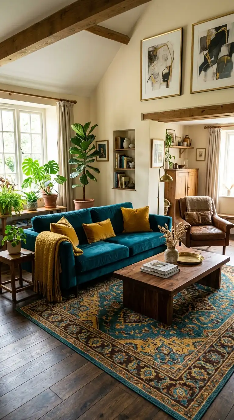Teal, mustard yellow, and warm brown create a rich, organic palette inspired by nature and global textiles. The jewel-toned teal provides depth, mustard adds vibrant energy, and brown brings grounding warmth. This combination works beautifully in eclectic, bohemian, and mid-century modern living rooms. Use brown on wood furniture and leather accents, mustard through pillows and accessories, and let the teal sofa anchor the space.