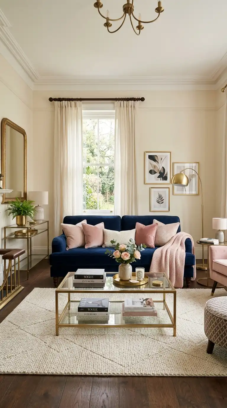 Navy blue, blush pink, and brass create one of the most sophisticated and unexpectedly beautiful color combinations in contemporary design. The deep navy provides dramatic foundation, blush adds soft romance, and brass introduces warmth and glamour. This palette works beautifully in modern, eclectic, and feminine-leaning spaces. Use blush through pillows, throws, and artwork, brass through lighting and accessories, and let the navy sofa anchor the room.