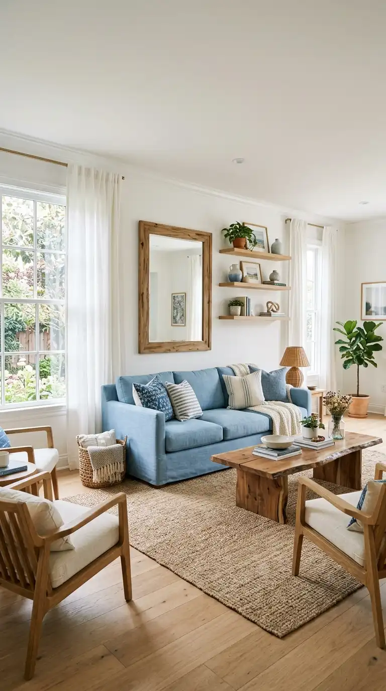 Sky blue, crisp white, and natural wood create a fresh, airy palette that feels both coastal and Scandinavian. The soft blue provides gentle color, white adds brightness, and wood brings organic warmth. This combination works beautifully in casual, coastal, and modern farmhouse living rooms. Use white on walls and trim, natural wood on furniture and flooring, and let the sky blue sofa add a soft pop of color.