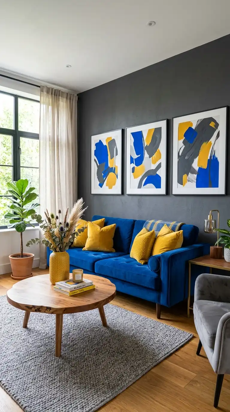 Cobalt blue, charcoal grey, and mustard yellow create a bold, energetic palette that feels modern and dynamic. The vibrant blue provides striking color, grey adds sophisticated grounding, and yellow introduces warmth and energy. This combination works beautifully in contemporary, eclectic, and mid-century modern living rooms. Use grey on walls or area rugs, yellow through pillows and accessories, and let the cobalt sofa be the undeniable focal point.
