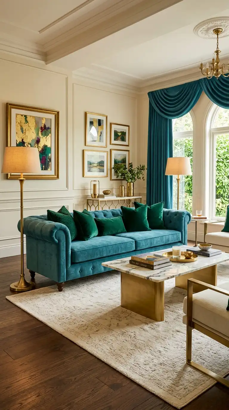 Teal, emerald green, and brass create a rich, jewel-toned palette that feels luxurious and organic. The teal provides depth, emerald adds richness, and brass introduces warmth and glamour. This combination works beautifully in formal, eclectic, and bohemian living rooms. Use emerald through velvet pillows and throws, brass through lighting and accessories, and let the teal sofa anchor the space with its beautiful blue-green hue.