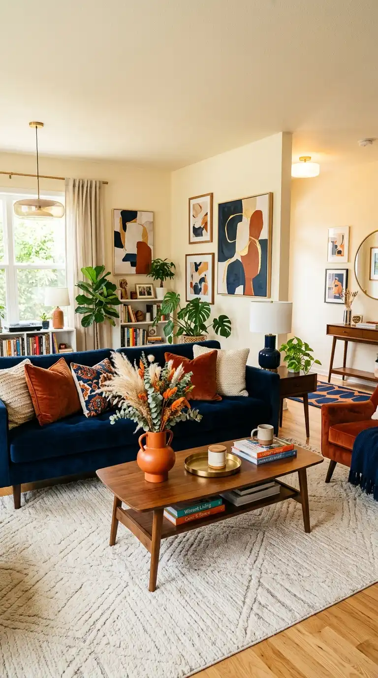 Navy blue, burnt orange, and cream create a vibrant, energetic palette inspired by complementary color theory. Blue and orange sit opposite each other on the color wheel, making this combination naturally dynamic and visually striking. The navy provides dramatic foundation, orange adds warmth and energy, and cream brings balance and softness. This palette works beautifully in eclectic, modern, and mid-century living rooms.