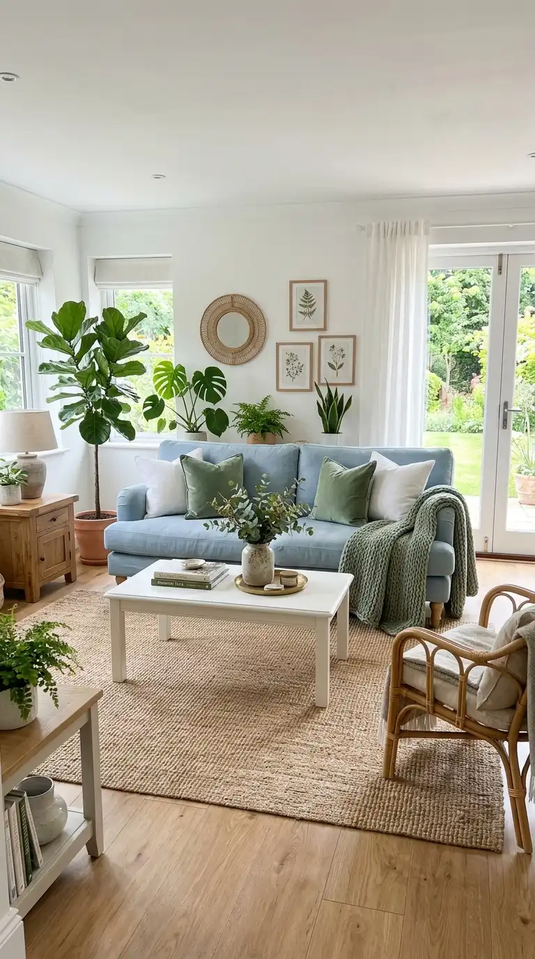 Powder blue, sage green, and white create a soft, nature-inspired palette that feels fresh and calming. The gentle blue and muted green harmonize beautifully, evoking sky and meadow, while white adds brightness and contrast. This combination works beautifully in coastal, cottage, and farmhouse living rooms. Use sage through pillows, throws, and plants, white on walls and trim, and let the powder blue sofa add soft color.