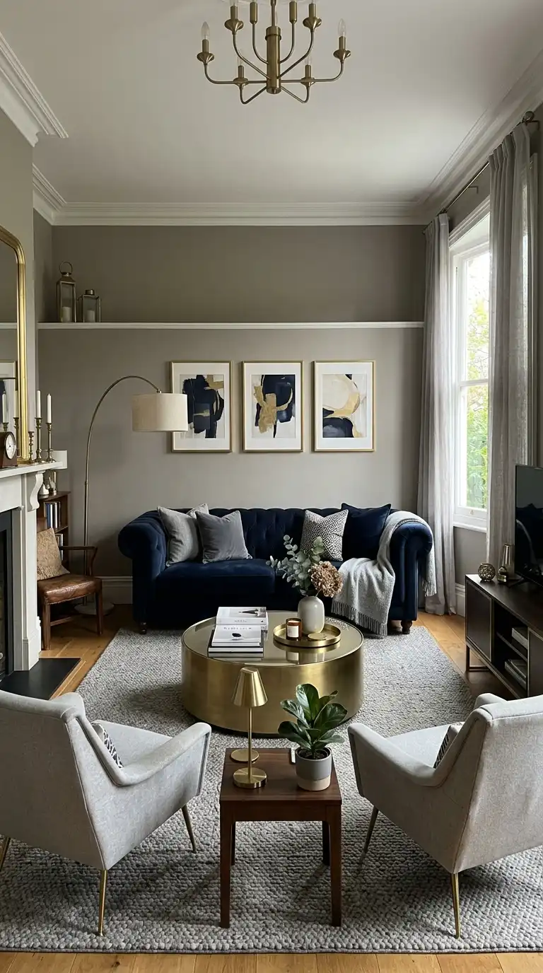 Navy blue, warm grey, and brass create a sophisticated, versatile palette that works in virtually every design style. The deep navy provides drama, grey adds neutral grounding, and brass introduces warmth and elegance. This combination works beautifully in traditional, modern, and transitional living rooms. Use grey on walls or area rugs, brass through lighting and accessories, and let the navy sofa anchor the space.