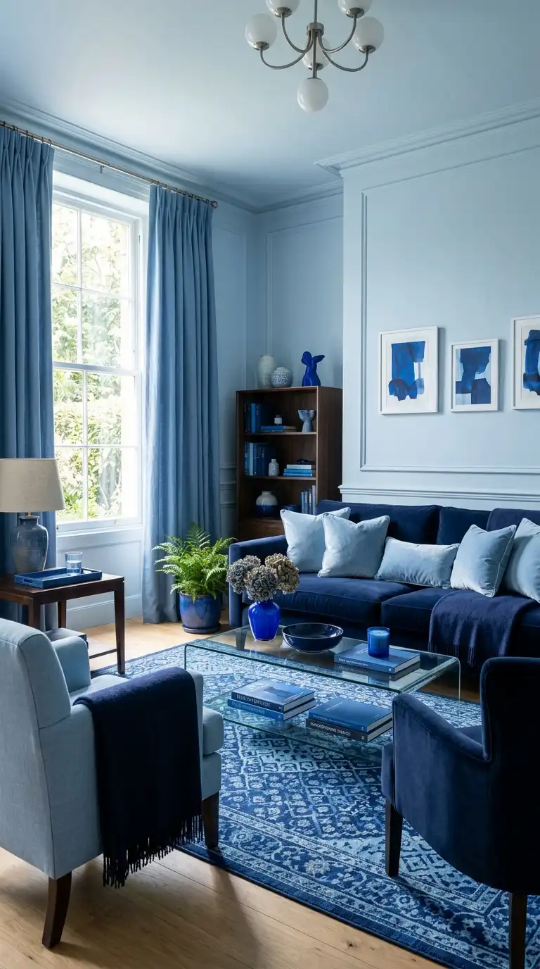 A monochromatic blue palette layers multiple shades, textures, and patterns of a single color for depth and interest. Start with a blue sofa in your preferred shade—navy, powder, or teal—then build around it with walls in a lighter blue, curtains in a deeper blue, pillows in varying blue patterns, and a rug with multiple blue tones. The key to successful monochromatic design is texture—velvet, linen, wool, cotton—all in varying blues create visual interest that prevents the scheme from feeling flat.
